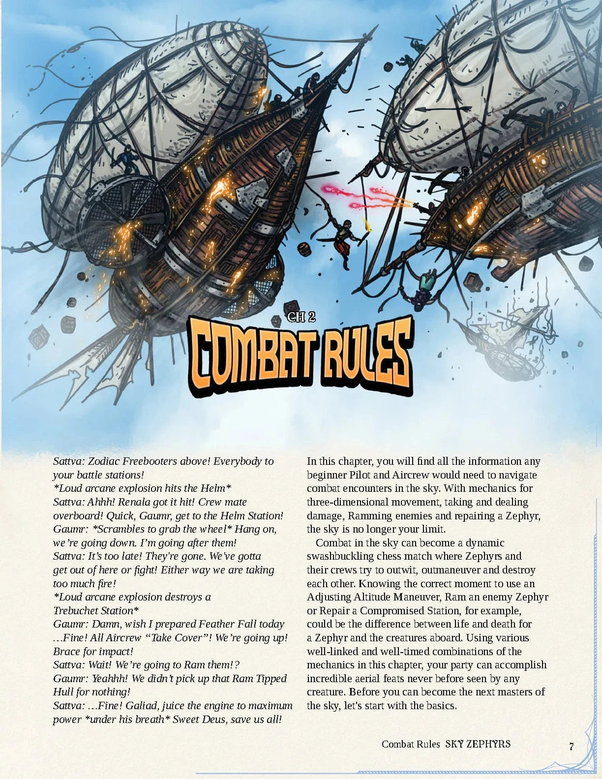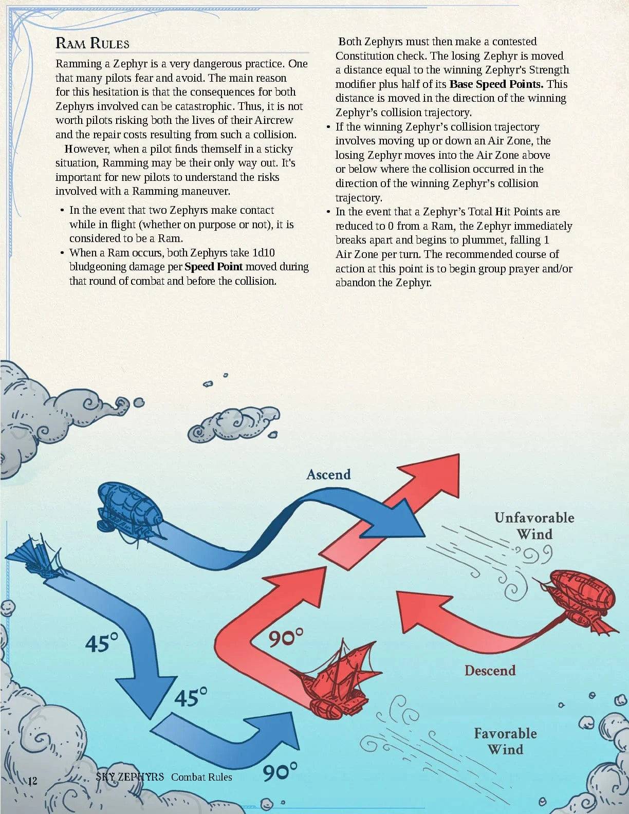 Vehicle Combat in the sky can become an ever-changing and strategic chess match where Zephyrs and their crews are trying to outwit, outmaneuver and destroy each other. Knowing the correct moment to board or Ram an enemy Zephyr, or even Repair a Compromised Station, could be the difference between life and death for your players and their Aircrew. Using various well-linked and well-timed combinations of the combat mechanics your players can accomplish incredible aerial feats never before seen by a creature.