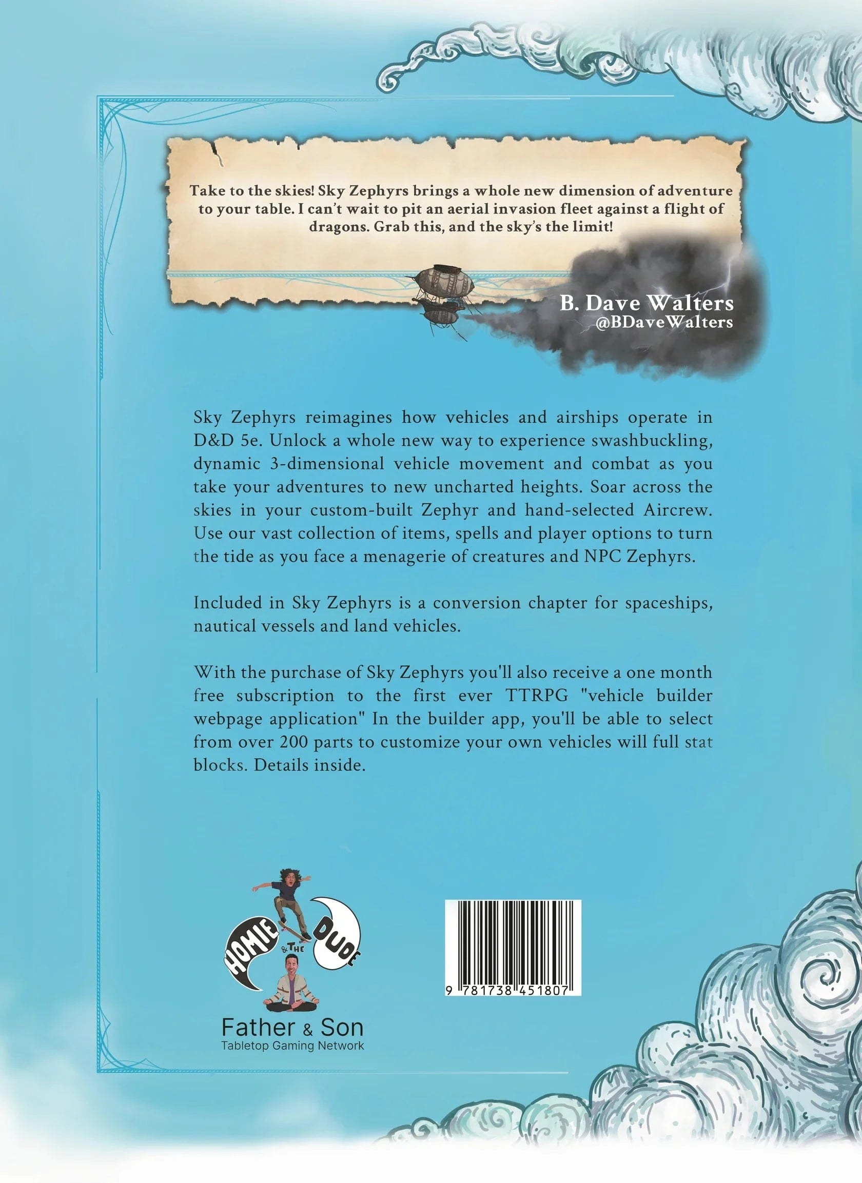 Sky Zephyrs is a 256 page tome that reimagines how vehicles and airships operate in DnD5e. Unlock a whole new way to experience swashbuckling, dynamic 3-dimensional vehicle movement and combat as you take your adventures to new uncharted heights. Soar across the skies in your custom-built Zephyr and hand-selected Aircrew. Use our vast collection of items, spells, and player options to turn the tide as you face a menagerie of creatures and NPC Zephyrs.