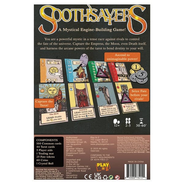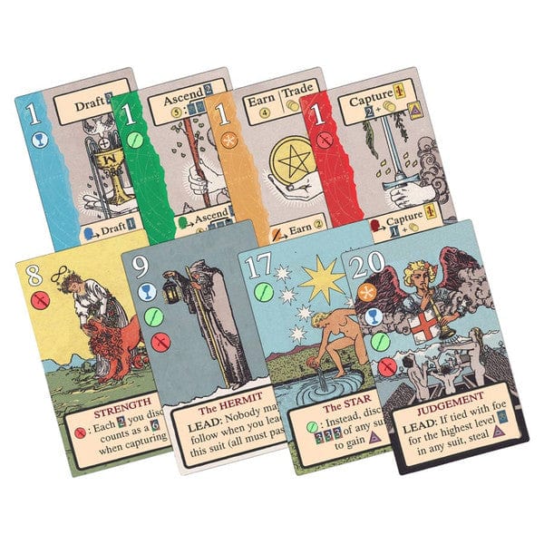 On your turn, choose an action: earn coins, draft cards, ascend to higher levels, or capture a tarot card. Rival soothsayers may choose to follow your action, but if you have a higher level, they must pay you for the privilege.