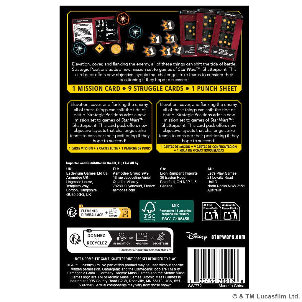 Strategic Positions adds a new mission set of 9 cards (3 Struggle I, II, and III) to games of Star Wars Shatterpoint. This card pack offers new objective layouts that challenge strike teams to consider their positioning, including rules for Tactical Advantages that allow players to unlock potent bonus abilities for certain units based on the active mission card.