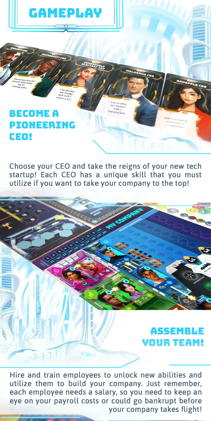 Choose your CEO and take the reins of your new tech startup! Each CEO has a unique skill that you must utilize if you want to take your company to the top.