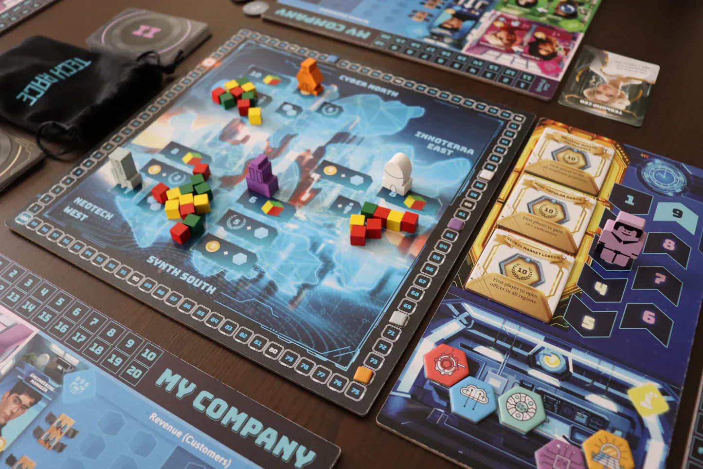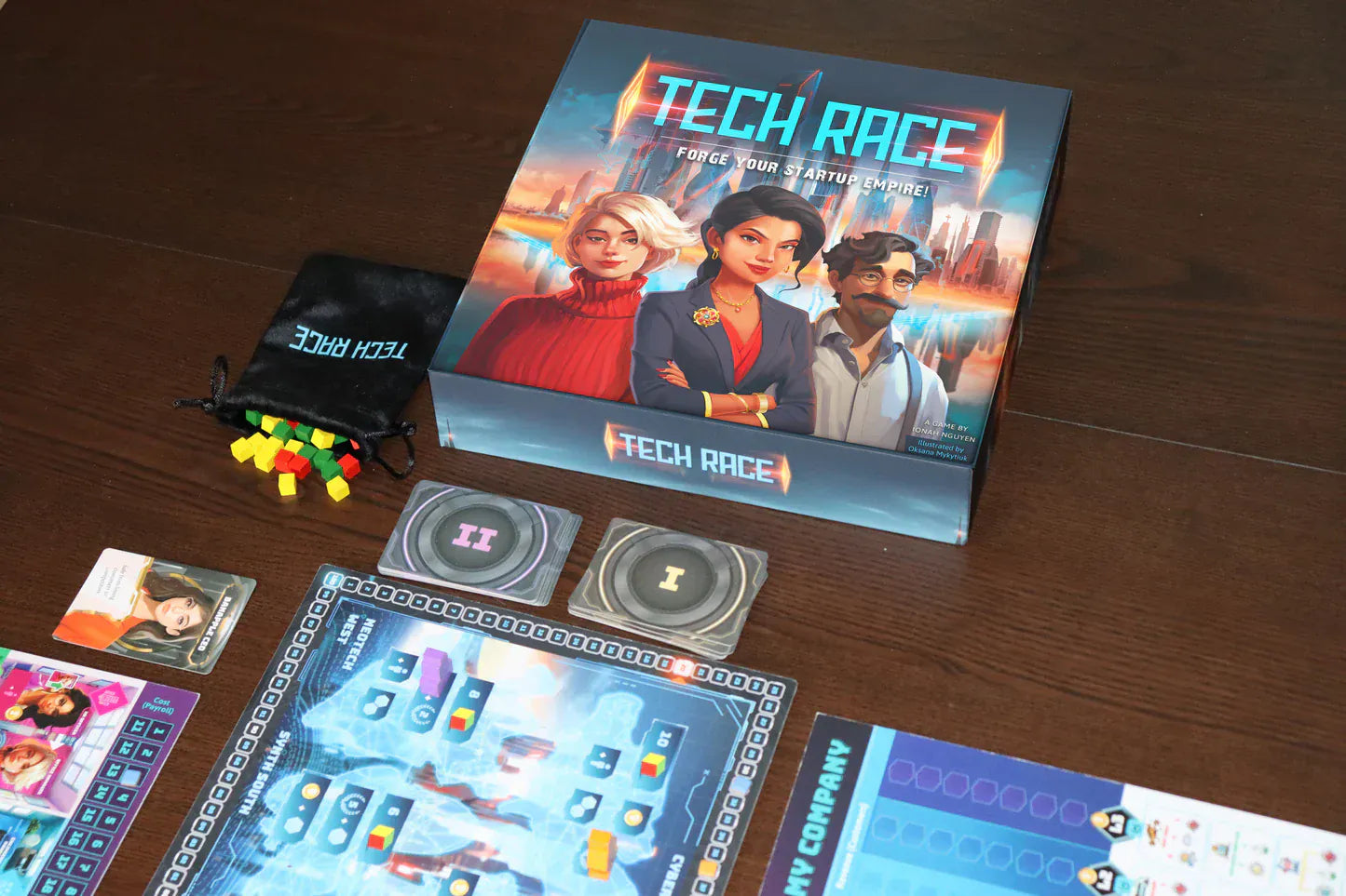 Tech Race is a medium-weight, Euro-style strategy game that simulates the dynamic, fast-paced world of tech startups. Players race to the highest startup valuation through smart hiring, innovation, and lobbying. Fast-paced and strategic, it captures the thrill of growing a company from the ground up with humor and surprises.