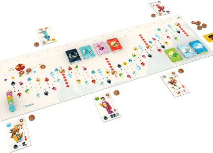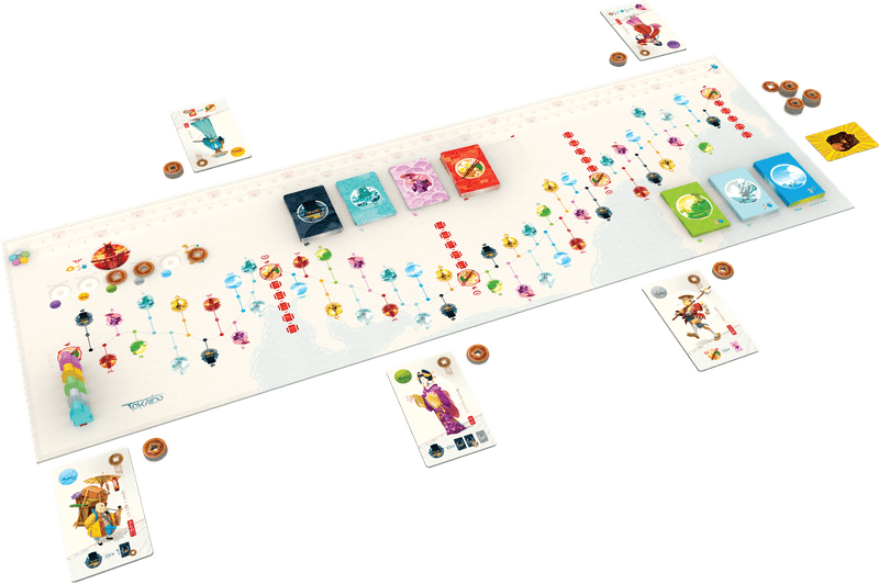 Tokaido features a time-track mechanism in which the active player is the person who is furthest behind on the path. When you are the active player, you can move your character as far forward as you’d like (with required stops at Inns), gaining different types of set-collection benefits at each unique location.