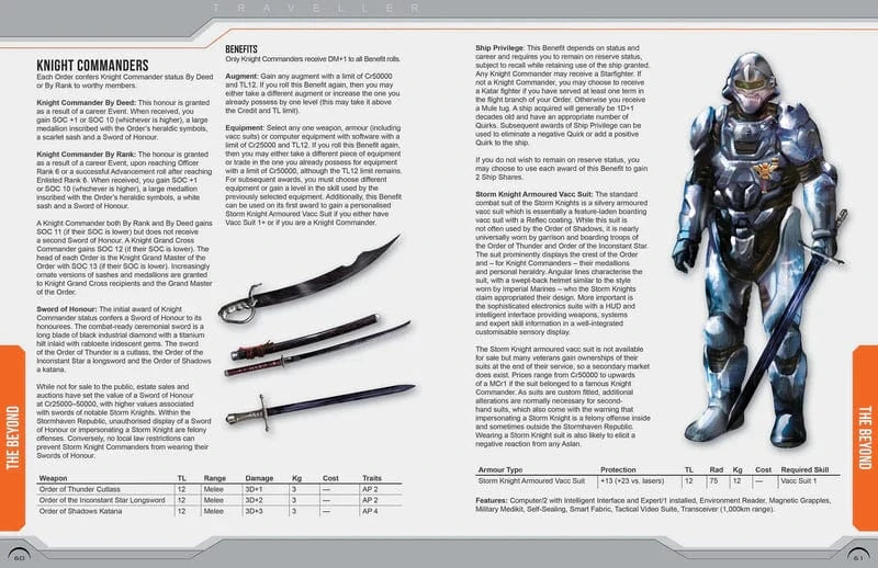 Spinward Extents presents two complete sectors near the edge of Charted Space: The Beyond and the Vanguard Reaches. The Beyond is a borderland between Aslan expansion and human pocket empires, both ancient and new. At the end of Imperial courier routes, it is home to the alien Sred*Ni, isolated worlds, and mysterious entities. The Storm Knights hold the line in an uneasy truce with Aslan clans, but other dangers and many opportunities await.