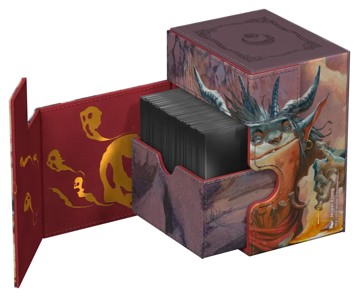 The Flip'n'Tray 133+ Xenoskin is a high-quality TCG deck box that offers premium card protection thanks to its resistant Xenoskin material, microfiber inner lining, and strong magnetic closure. The deck box has an integrated and removable accessory tray for dice that can be accessed independently and is printed in full color with officially licensed artworks from Magic: The Gathering's upcoming set "Lorwyn Eclipsed". The Flip'n'Tray 133+ Xenoskin is optimized to hold 133 double-sleeved or 160 single-sleeved cards in Ultimate Guard sleeves.