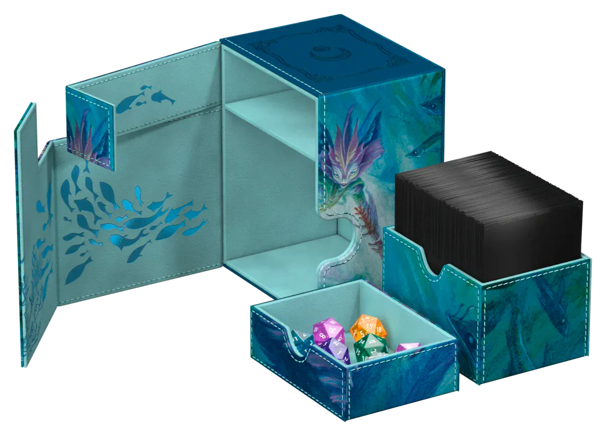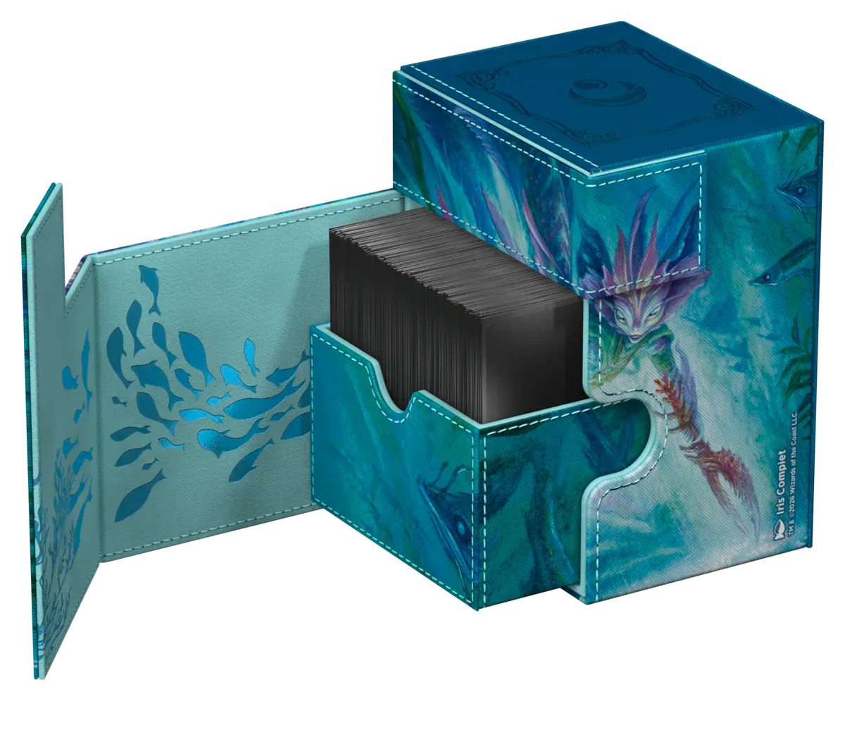 The Flip'n'Tray 133+ Xenoskin is a high-quality TCG deck box that offers premium card protection thanks to its resistant Xenoskin material, microfiber inner lining, and strong magnetic closure. The deck box has an integrated and removable accessory tray for dice that can be accessed independently and is printed in full color with officially licensed artworks from Magic: The Gathering's upcoming set "Lorwyn Eclipsed". The Flip'n'Tray 133+ Xenoskin is optimized to hold 133 double-sleeved or 160 single-sleeved cards in Ultimate Guard sleeves.