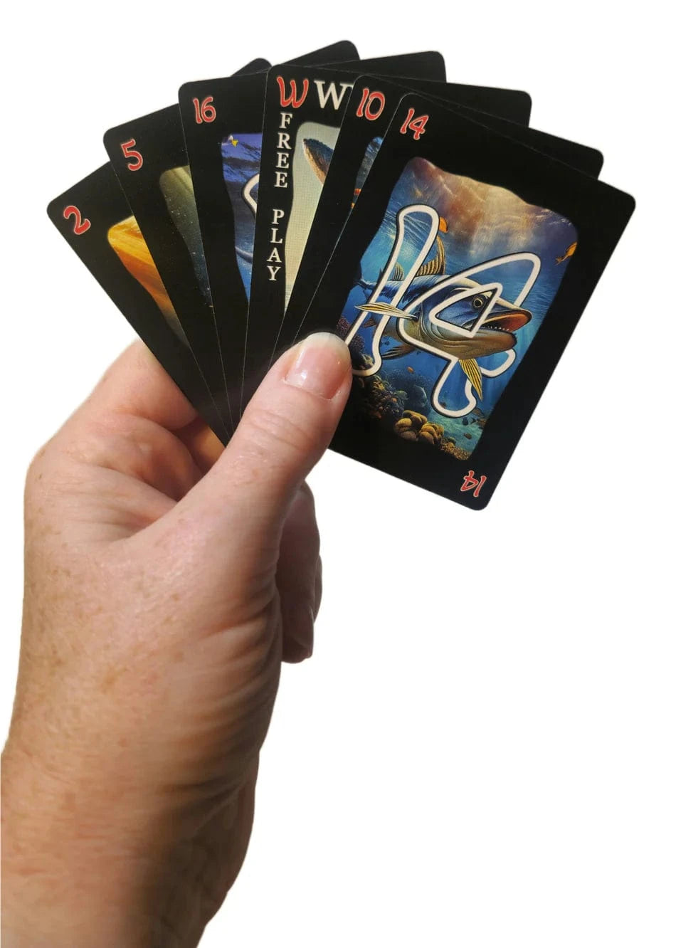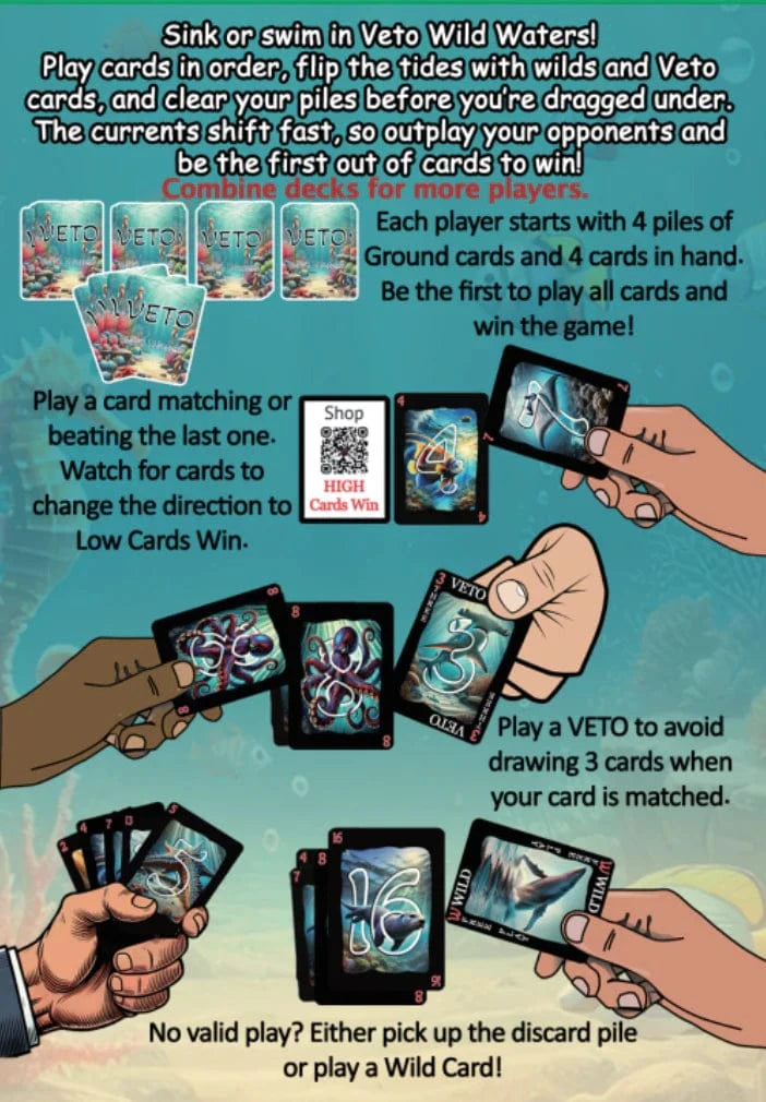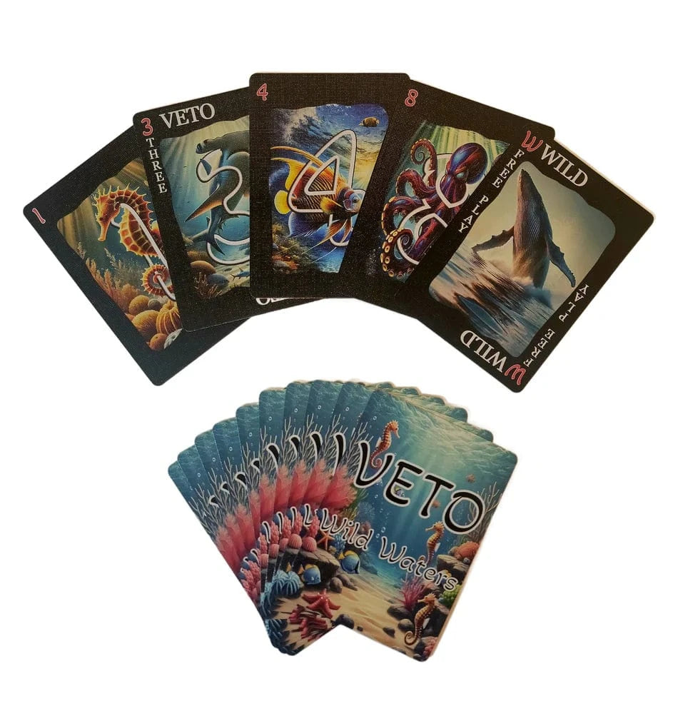 Outsmart opponents by discarding wisely, playing multiple cards and using your VETO card to dodge the currents of trouble. But beware - wild waves of the Hand Cleaner and action-packed cards like the mighty playful dolphins can turn the tides at any moment! Don't be the last fish in the sea holding cards!