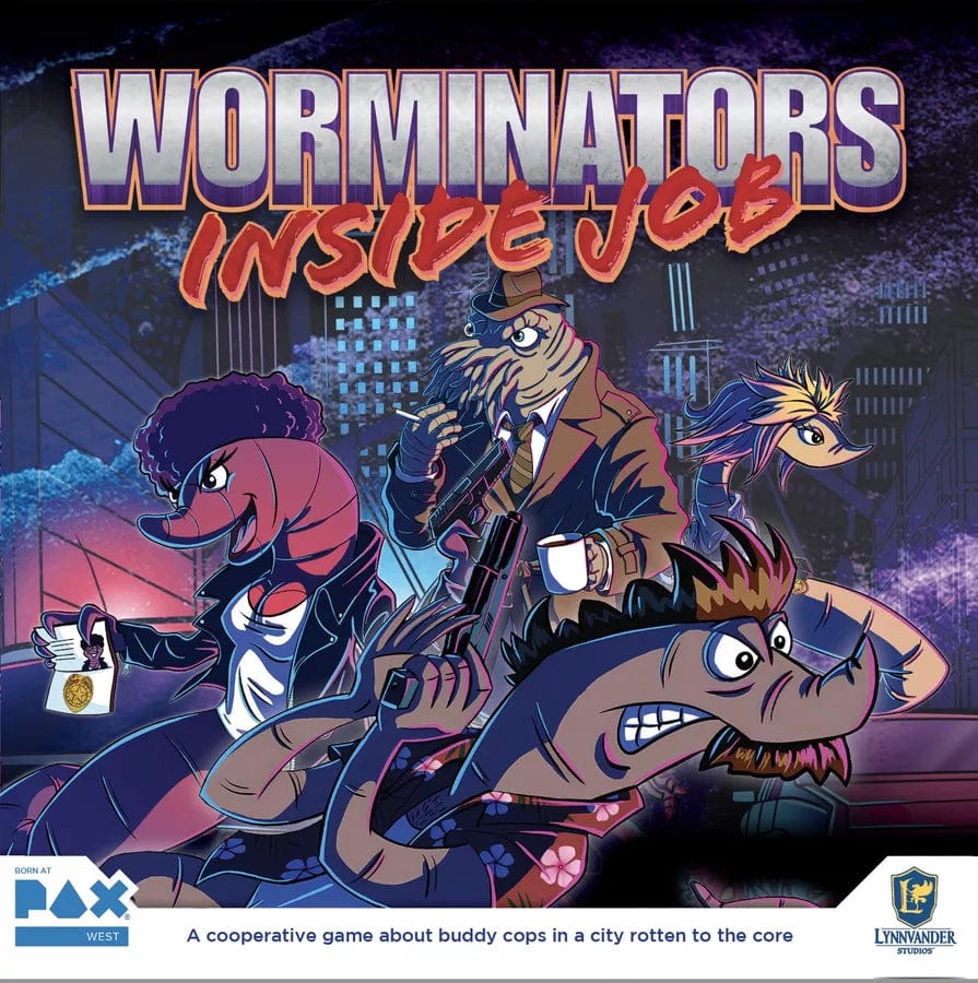 Worminators: Inside Job is a game Born at PAX. What does “Born at PAX” mean? We at Lynnvander Studios teamed up with the PAX team to run a panel called Design a Board Game Live. Worminators: Inside Job was conceived by the crowd at PAX West 2022. They came up with the combination of buddy cop worms, and we refined their ideas into the board game you’re holding now!