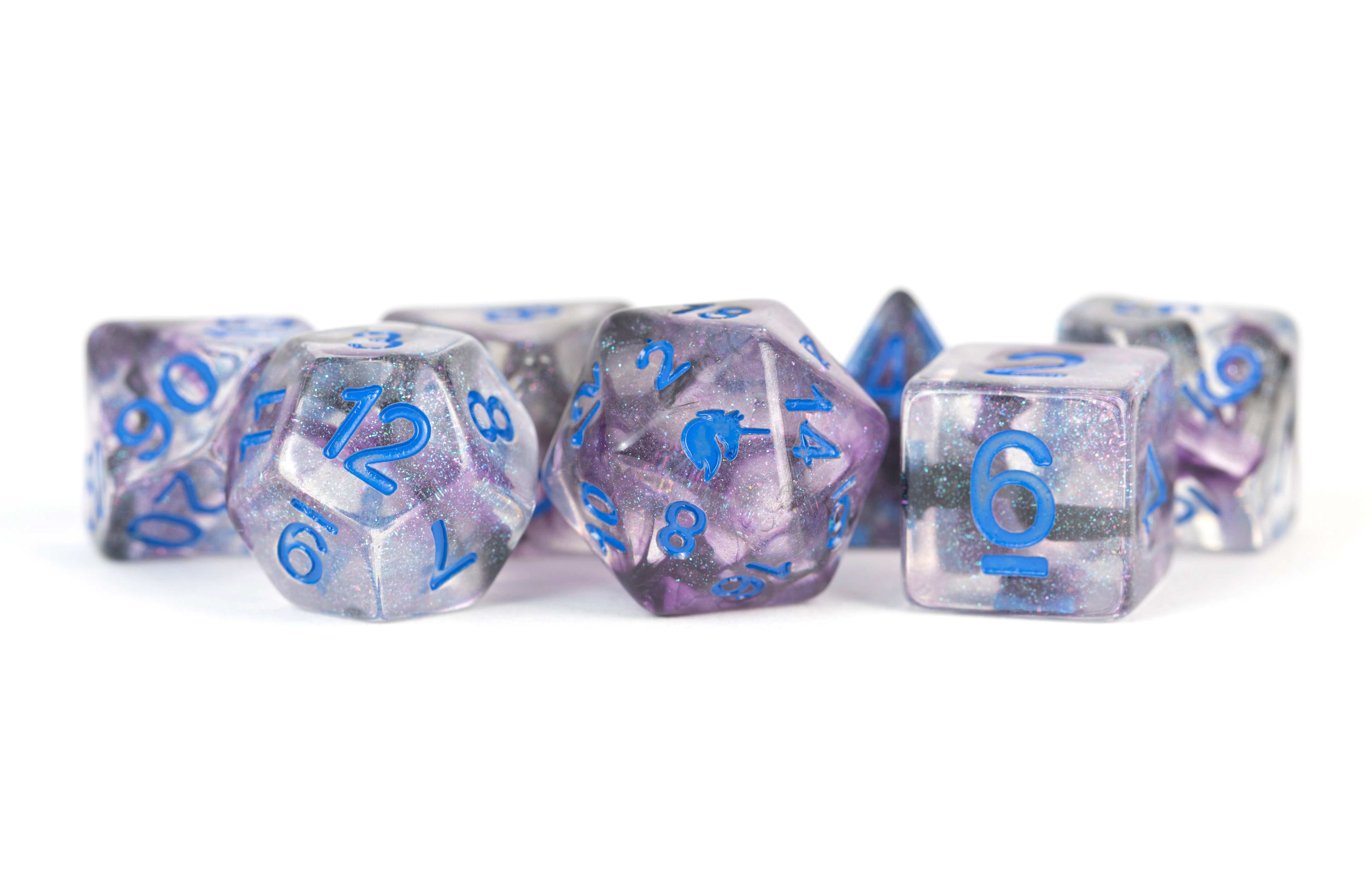 From our legendary Kickstarter, Unicorn dice are a beautiful mix of transparent resins, which are then infused with prismatic glitter dust that changes from blues to purples to greens as it hits the light. Each 16mm polyhedral set comes with 7 dice (d4, d6, d8, d10, d10 (00-90), d12, and d20).