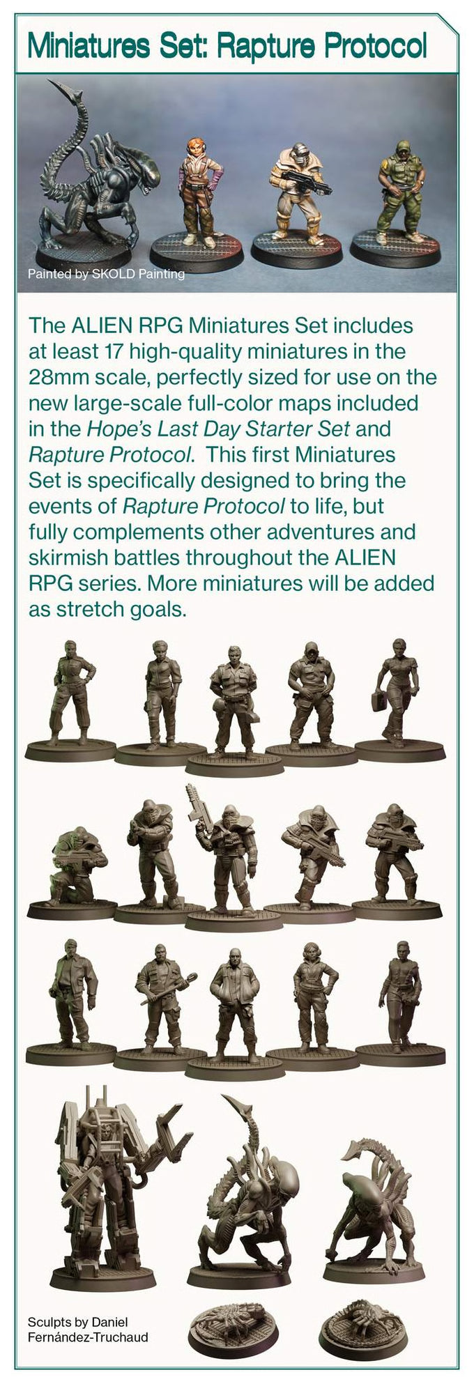 ALIEN RPG Miniatures Set: Rapture Protocol includes 20 high-quality hard plastic miniatures for the official ALIEN The Roleplaying Game. This set is specifically designed to bring the events of the Rapture Protocol cinematic adventure to life but fully complements other adventures and skirmish battles throughout the ALIEN RPG series. These miniatures in the 28mm scale are perfectly sized for use on the large battle maps included in cinematic adventures for the ALIEN RPG Evolved Edition, such as Rapture Protocol and Hope’s Last Day. No assembly required!