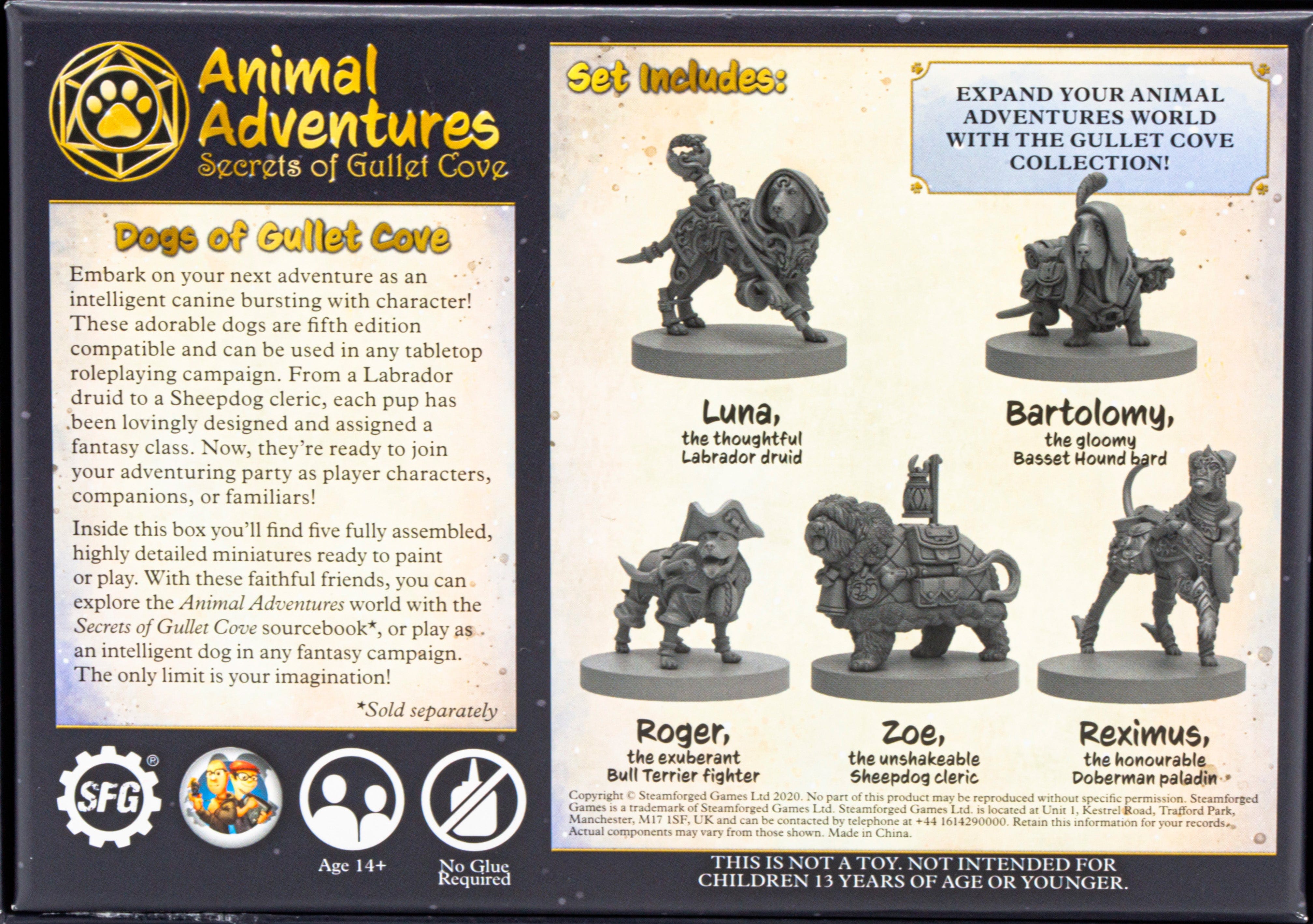 With these faithful friends, you can explore the Animal Adventures world with the Secrets of Gullet Cove sourcebook*, or play as an intelligent dog in any fantasy campaign. The only limit is your imagination!