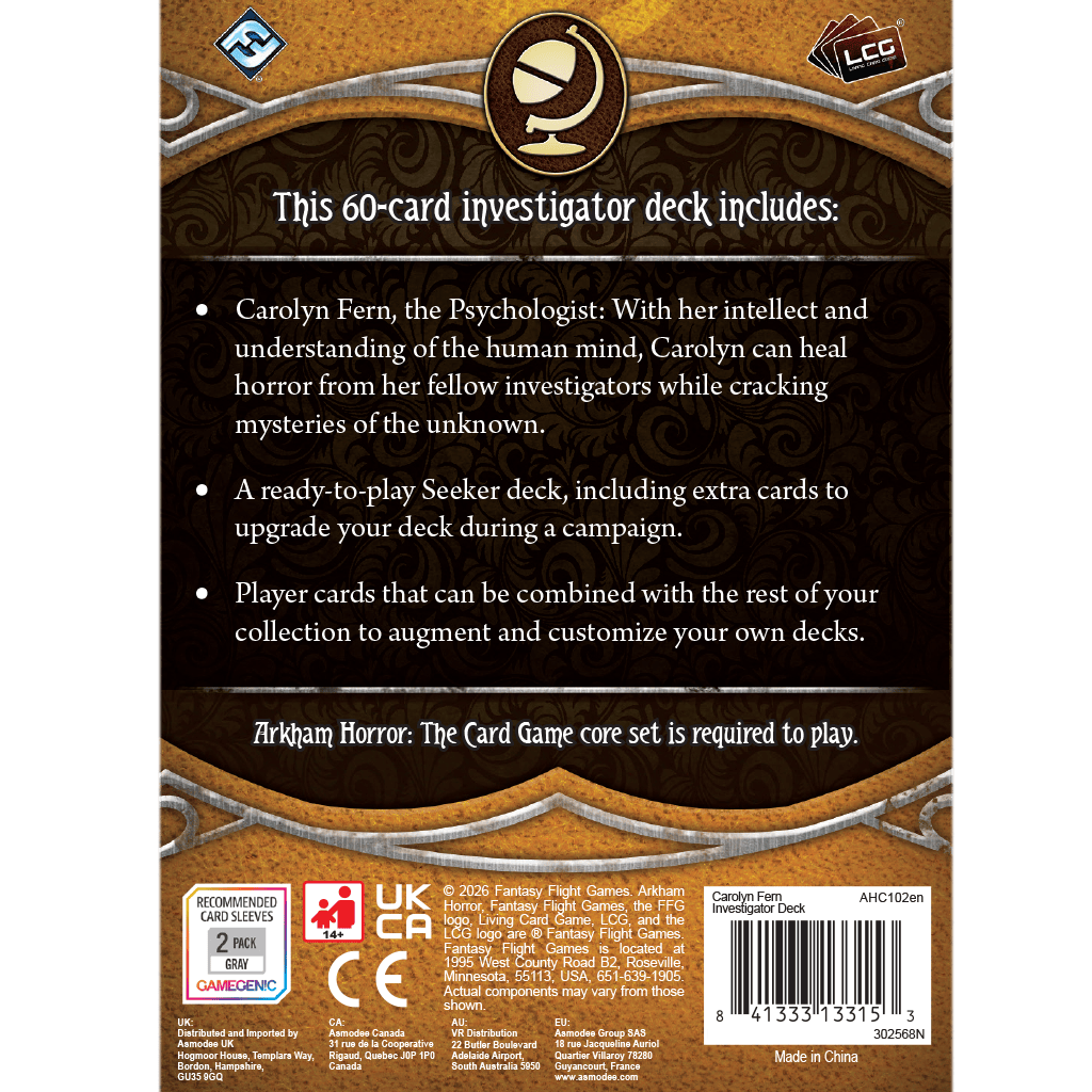 As the enigmatic secrets of the Mythos begin to unfold, it takes a keen mind like Carolyn Fern’s to help piece everything together. With her intellect and deep understanding of the human mind, Carolyn can heal horror from her fellow investigators while cracking mysteries of the unknown. This Investigator Deck for Arkham Horror: The Card Game comes with a pre-built, ready-to-play Seeker deck, allowing you to jump into a campaign from the moment you open the box. Also included are additional cards for upgrading the deck during a campaign.