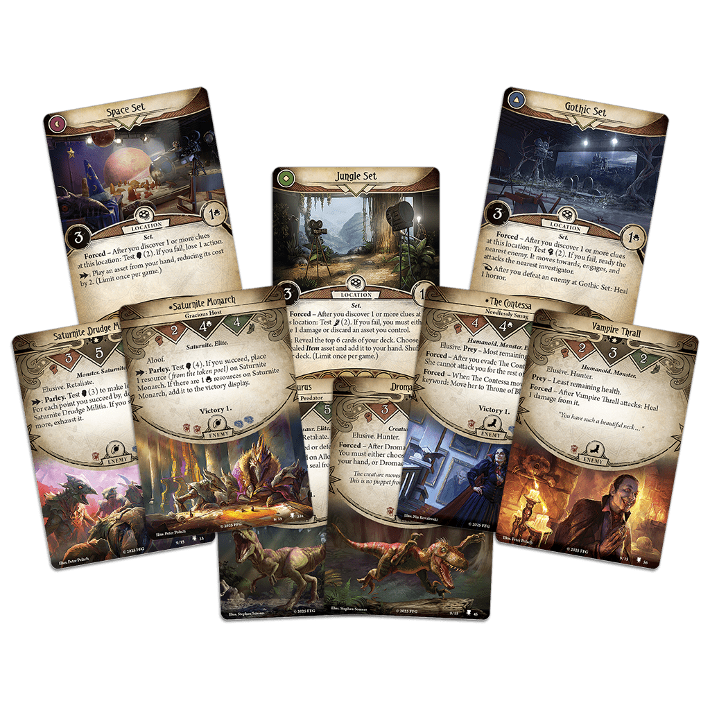 Welcome to Film Fatale, the latest scenario pack for Arkham Horror: The Card Game! In this showstopper scenario, one to four investigators ham it up in Hollywood’s Lot C, where three troubled film sets are host to several bizarre and dangerous events. As spacetime warps and fiction becomes reality, you’ll find yourselves negotiating with alien Saturnites, fleeing from hungry dinosaurs, and warding off bloodthirsty vampires as you try to wrap up this thrilling mystery. As with previous scenario packs, Film Fatale can be played standalone or inserted into a campaign as a side-story. With multiple ways the scenario can play depending on which movie set is the main feature, this is one blockbuster that will keep you coming back again and again.