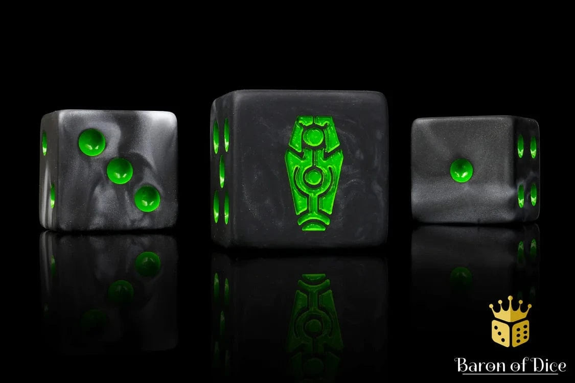 These contain a base of pitch black swirled with metallic silver veins and inlaid with a glowing gauss green; resin 16mm dice.  The symbols are on the 6 side. These dice have an option of round corner or square corner; choose wisely! Our premium dice come in a unique reusable metal tin.