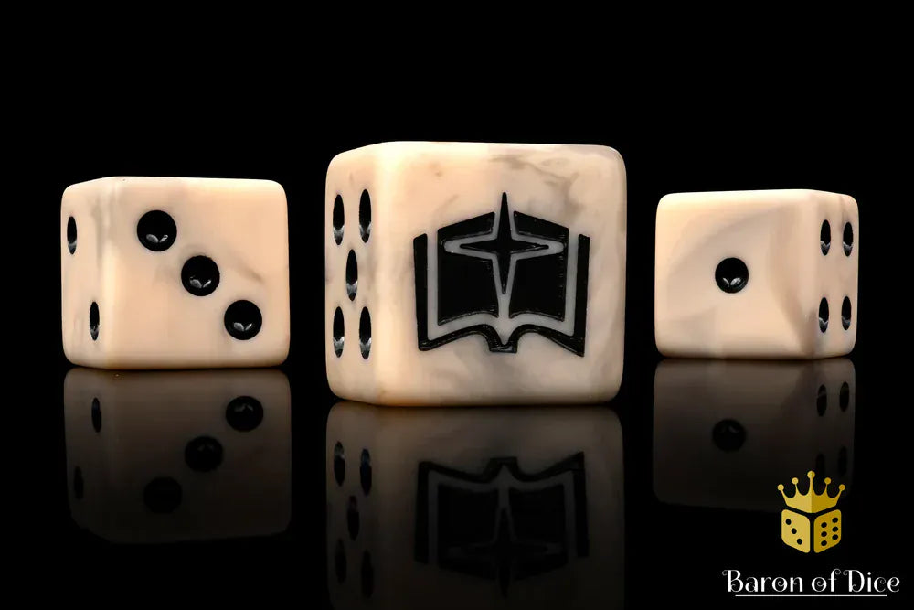These contain a blend of worn book beige with veins of paper whites and inlaid with a pure black; resin 16mm dice.  The symbols are on the 6 side. Our premium dice now come in a unique reusable tin.