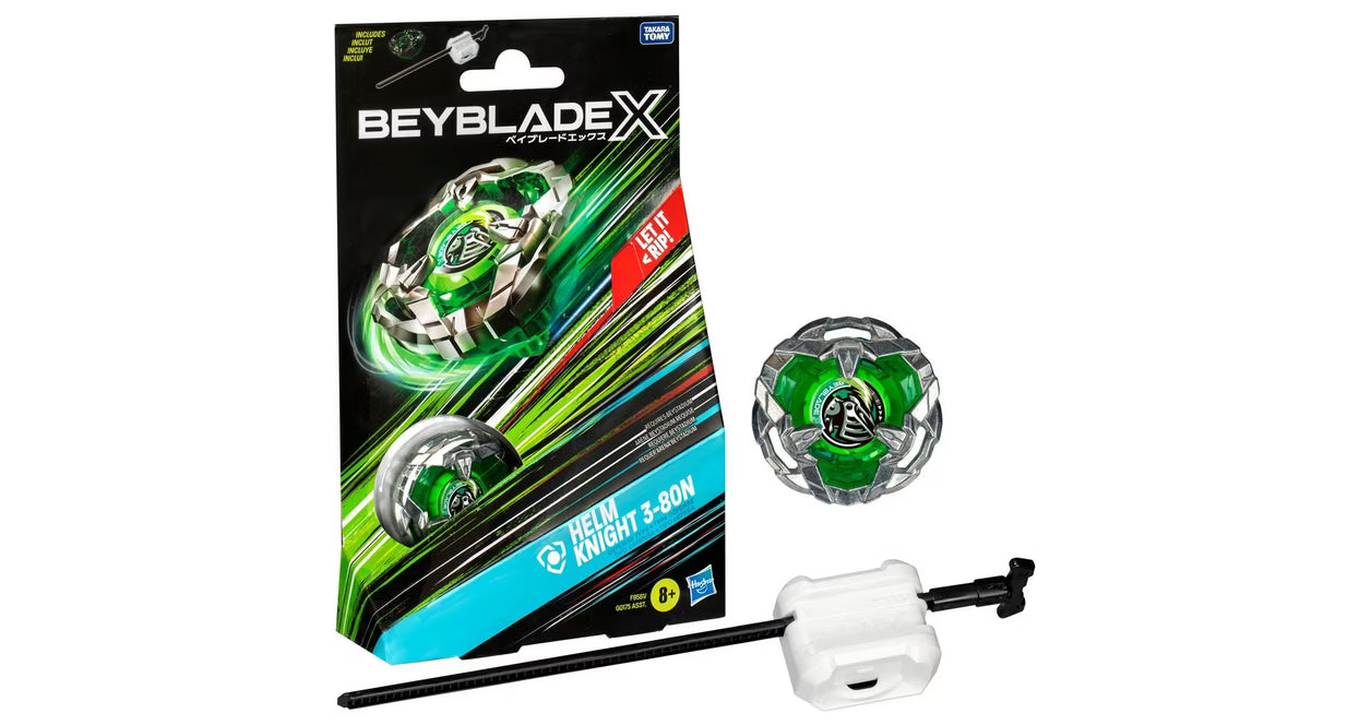 Experience the thrill of the next generation of Beyblade stadiums, launchers and tops: Beyblade X with the Beyblade X Helm Knight 3-80N Starter Pack which includes 1 right-spinning Balance Type top and launcher (Beystadium required, sold separately). Launch right into battle or reconfigure the interchangeable blade, ratchet, and bit of this Starter Pack with those of other Beyblade X tops (sold separately) to create your own unsurpassable Bey. Beyblade X features the X-Celerator Gear System innovation to level-up your game. When the gear of a Beyblade X top engages the rail of the Beystadium arena, it can super-accelerate into an Xtreme Dash rocketing it around the stadium for crushing collisions and epic bursts. Bladers launch their tops into fierce clashes against their opponent’s scoring points with each confrontation – first to score 4 points wins. Hasbro Beyblade toys with authentic Takara Tomy die-cast metal tops make great kids gifts for boys and girls ages 8 and up.