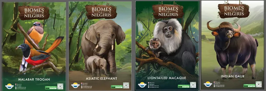 Biomes of Nilgiris is a board game in which players venture into India's surreal Nilgiri biosphere, teeming with unique flora and fauna. As conservationists — ecologists, photographers, and citizen scientists — they aim to discover new species, address ecological issues, complete conservation missions, and earn ecology points.