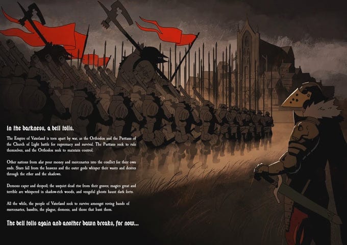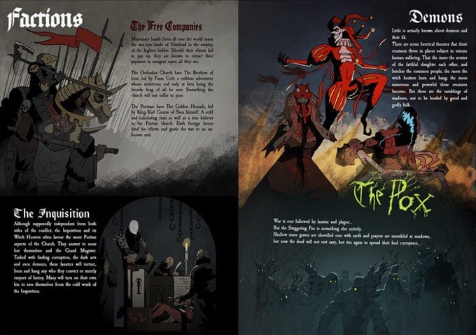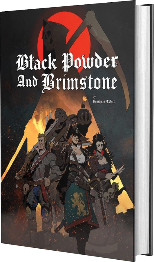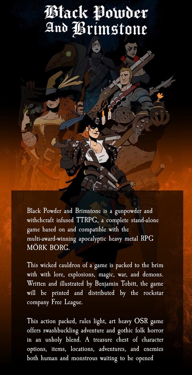 Black Powder and Brimstone is a gunpowder and witchcraft infused TTRPG, a complete stand-alone game based on and compatible with the multi-award-winning apocalyptic heavy metal RPG MÖRK BORG. This wicked cauldron of a game is packed to the brim with with lore, explosions, magic, war, and demons. Written and illustrated by Benjamin Tobitt. This action packed, rules light, art heavy game offers swashbuckling adventure and gothic folk horror in an unholy blend. A treasure chest of character options, items, locations, adventures. and enemies both human and monstrous waiting to be opened