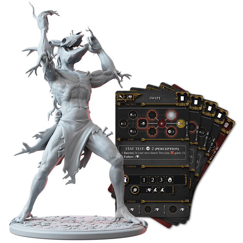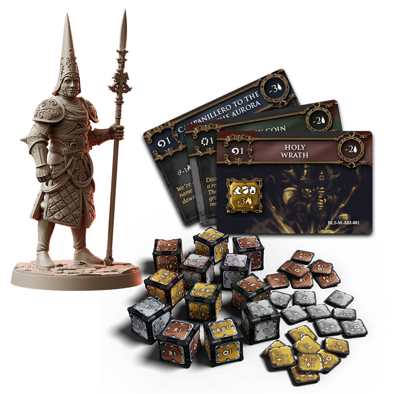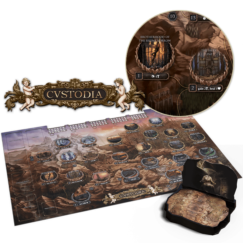 Blasphemous: The Board Game is an epic adventure that takes you into the dark world of Cvstodia, culminating in epic battles against final Bosses. Each game is enriched by narrative descriptions in the exploration booklets that help players immerse themselves in the game’s unique atmosphere. Penitents grow through the use of customizable dice that allow them to improve their character through prayers, beads and skills. The map of the game follows in the connections found in the video game, offering players a familiar experience, but enhanced by magnifying glasses on key locations, providing an even more immersive and detailed view of the world of Cvstodia.
