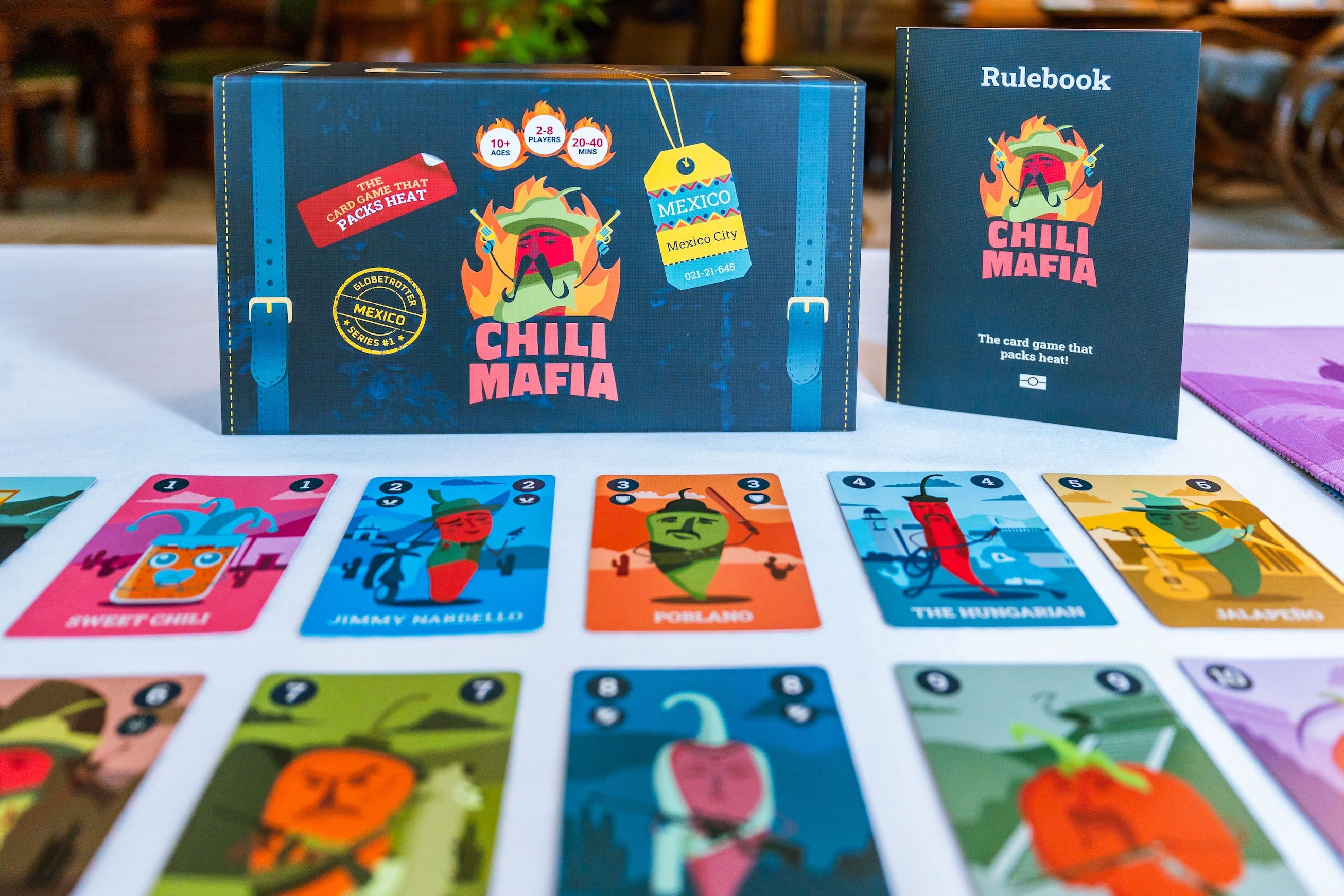 Chili Mafia is the first game in the Globetrotter Game Series. It is a fun 2-8 player set-collection party card game, inspired by Mexico. Play individually or in teams, and build chili pepper gangs to score the most points in the 'Card game that packs heat'.