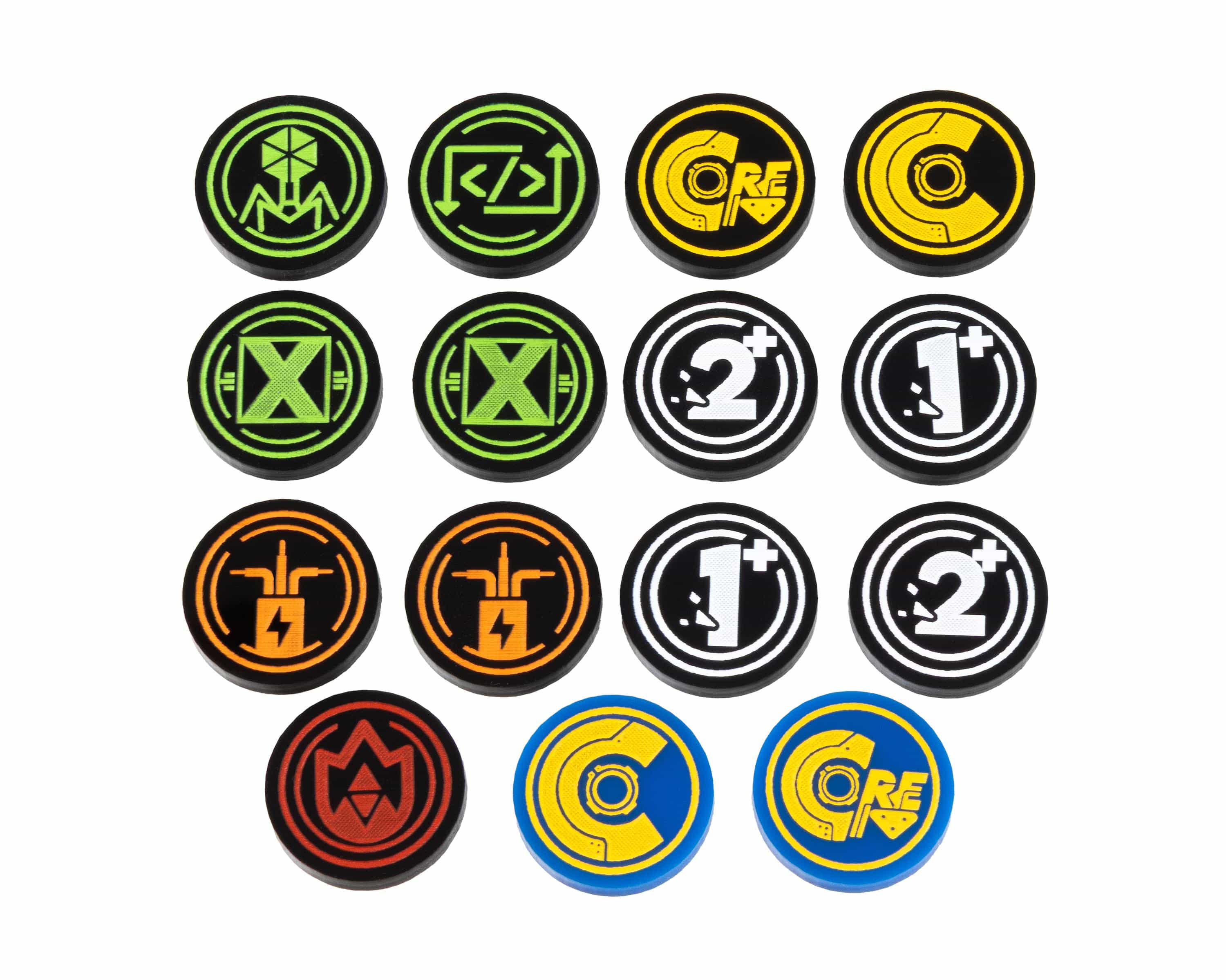 15 tokens per set. Double sided, premium painted Acrylic tokens come with 15 individual pieces! Contains: 2x Double sided Max & Current Core Charge token; 2x Generic double sided reminder tokens; 2x Lockout token; 2x Short Circuit token; 1x Firewall token; 1x Rootkit token; 1x Virus token; 4x Double sided +1/+2 token; 15 total tokens. The Premium Tokens are perfect for all players looking to improve their gameplay experience of Chrono Core!