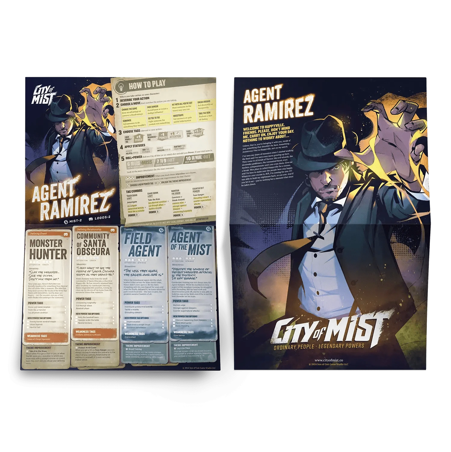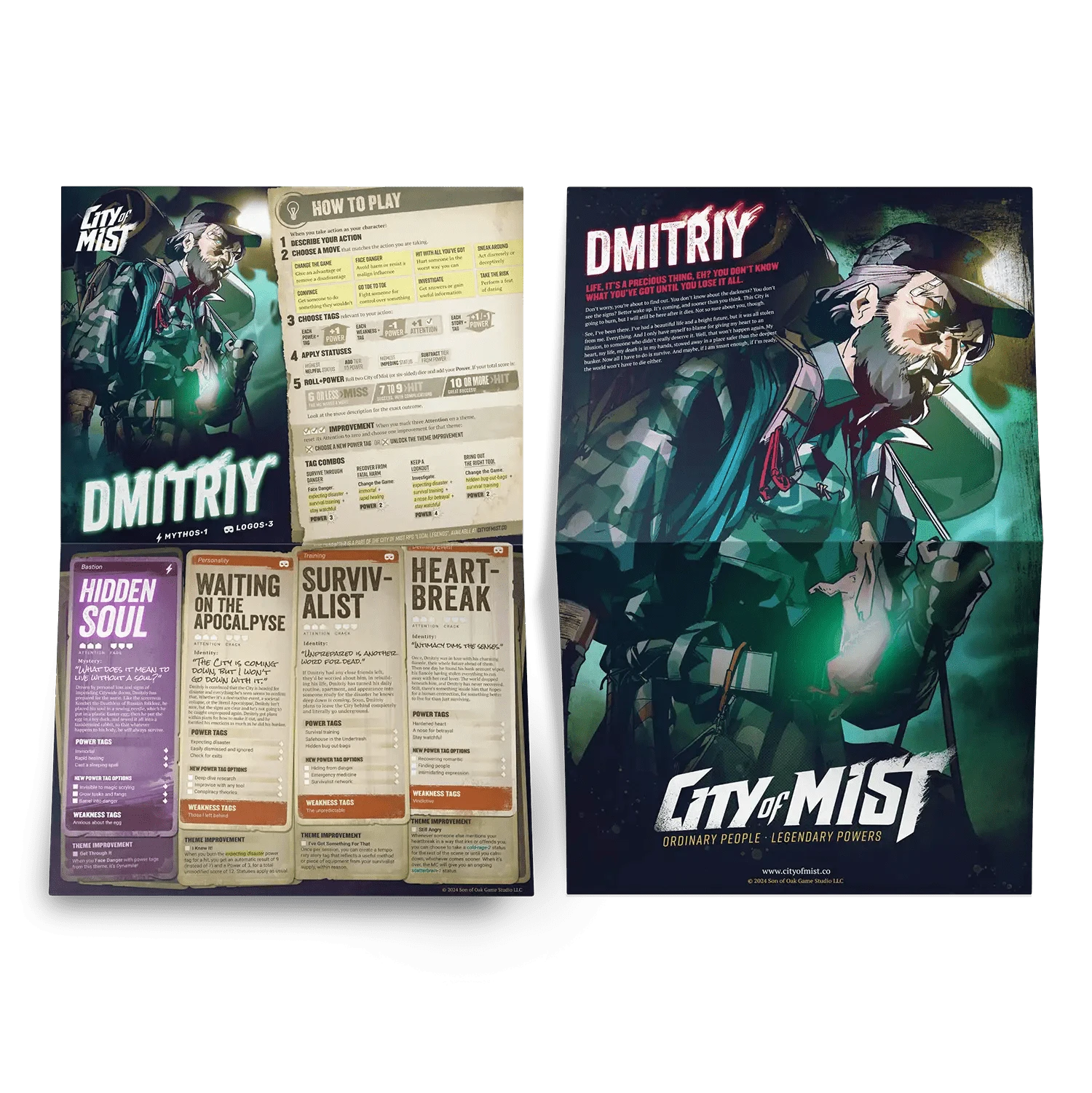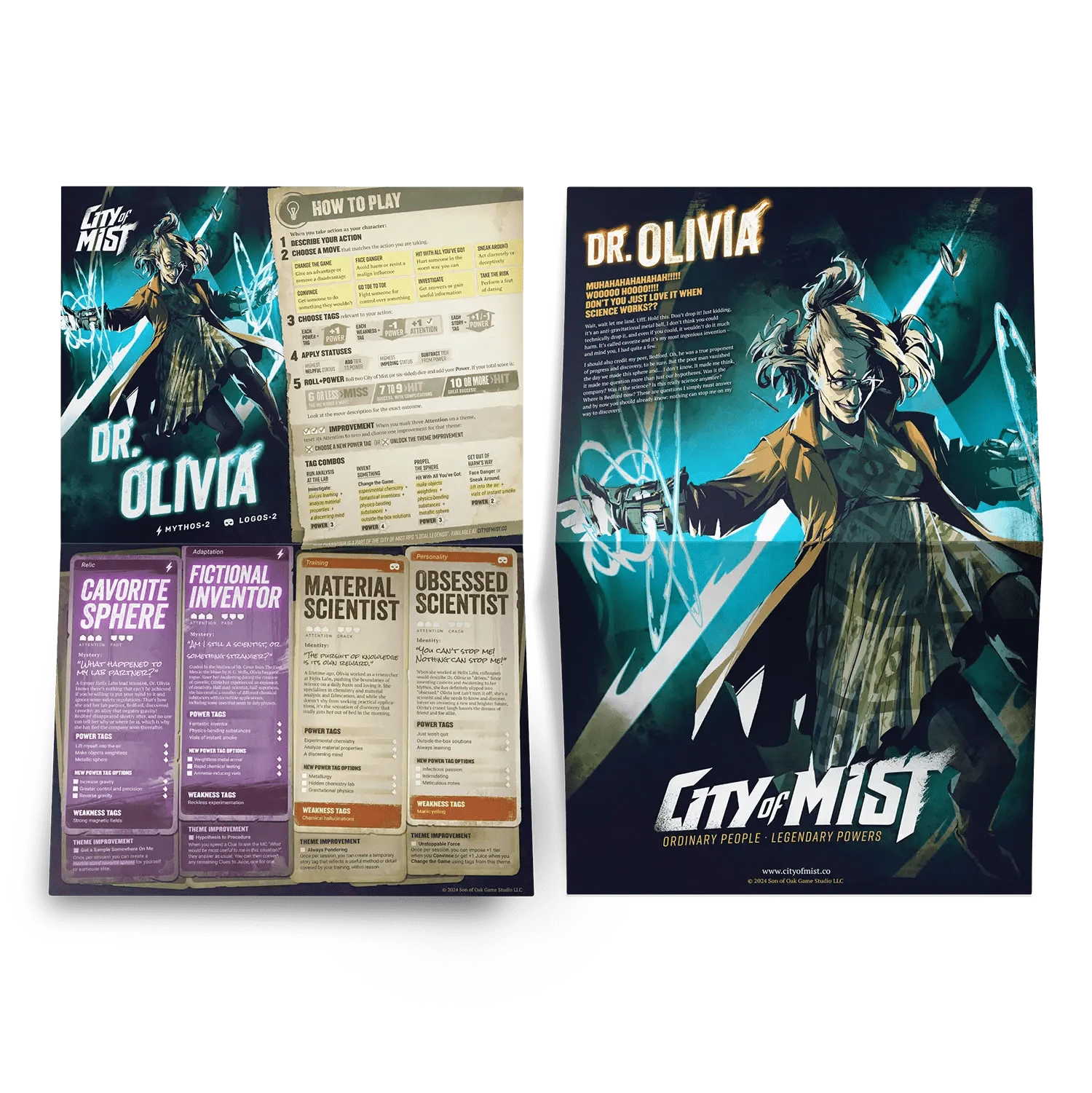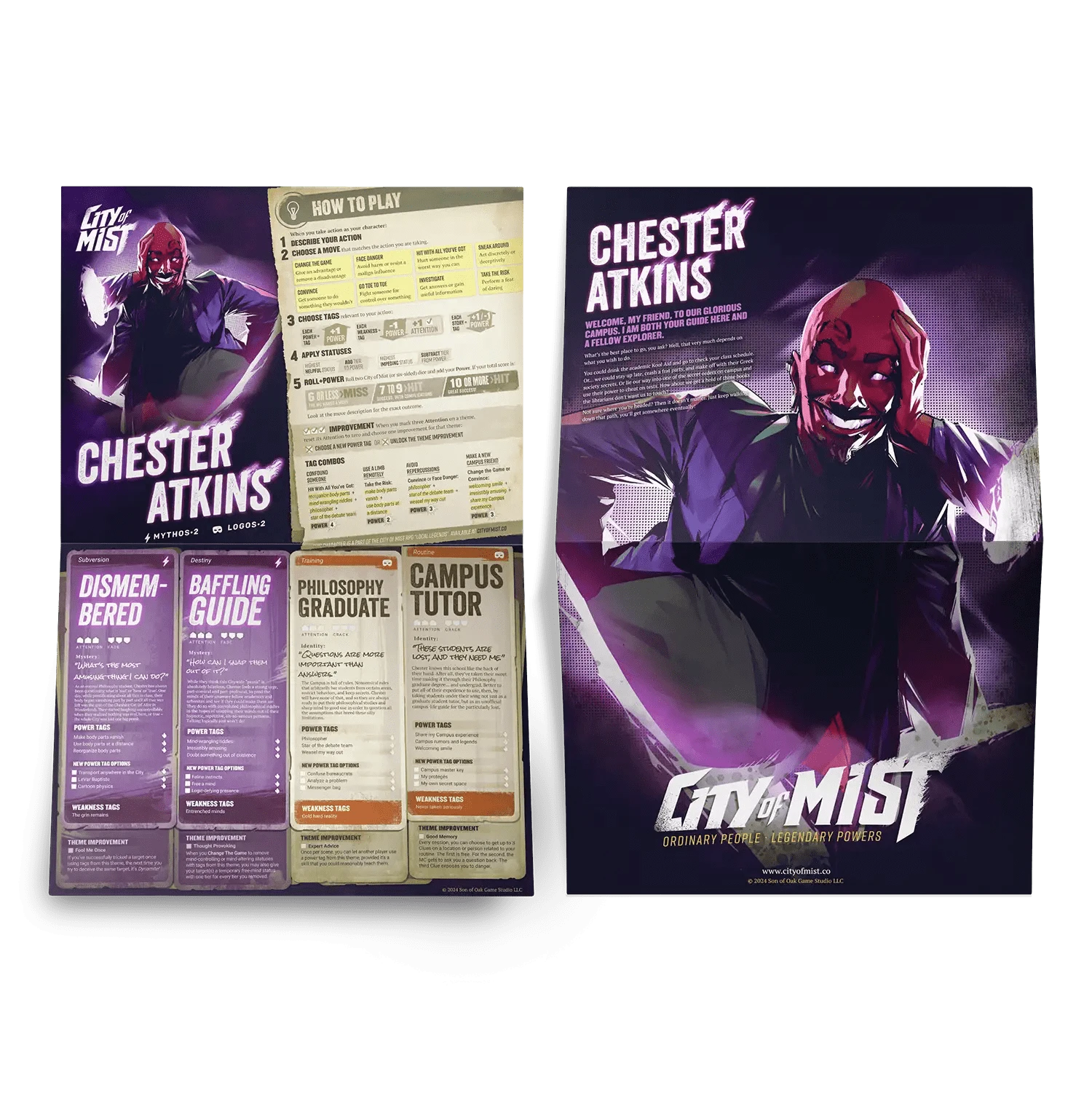 Ten (10) beautifully-illustrated pregen character folios that double as posters from the different districts of the City of Mist!