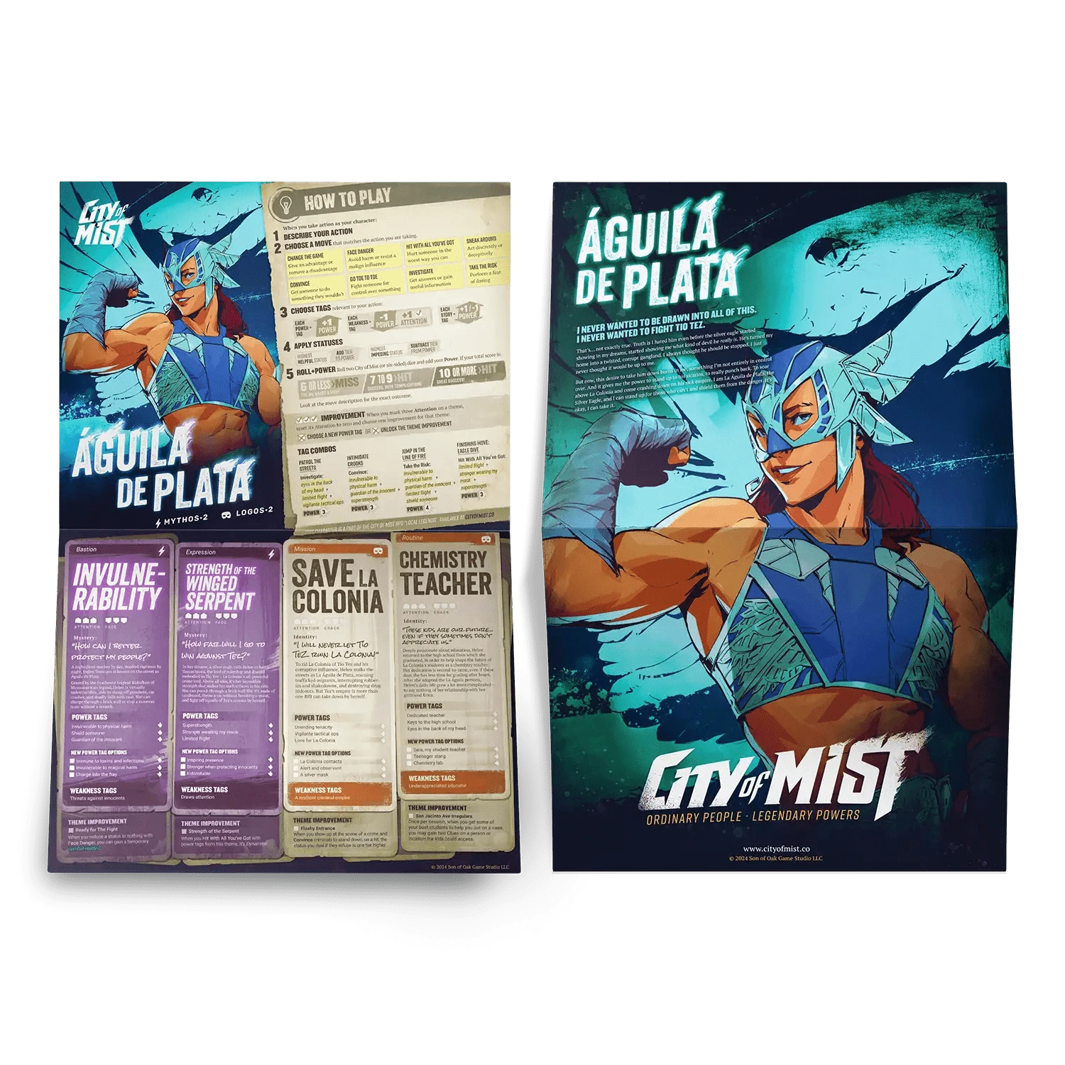 The Character Folio Pack 2 contains 10 two-sided and foldable US-letter sized character folios that can also double as posters, a graphic summary of the game rules and dice roll outcomes, and suggestions for cool tag combos.