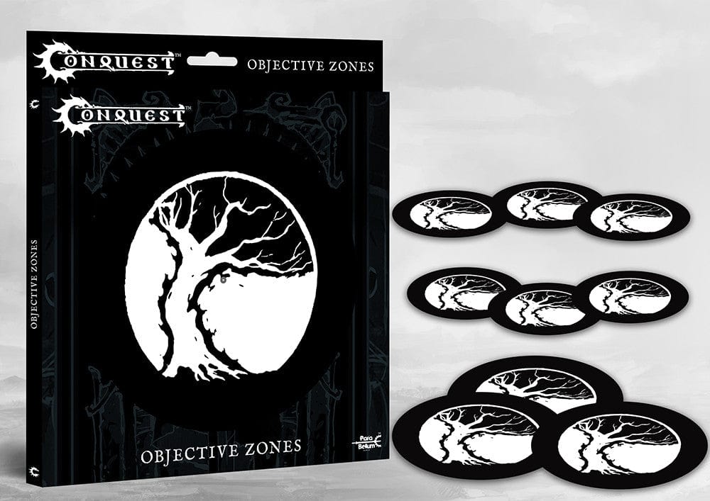 This is a set of 9 Objective Zones in Black with the White Nords Faction Logo that brings more Conquest look and feel to your table. A new and unique material that won't slip on the table, but will allow your models to easily slide over, off and around, these are ultra thin made of .5mm polypropylene. Great for any wargame play. Three 9" Zones and Six 6" Zones packaged together. Made in the EU.