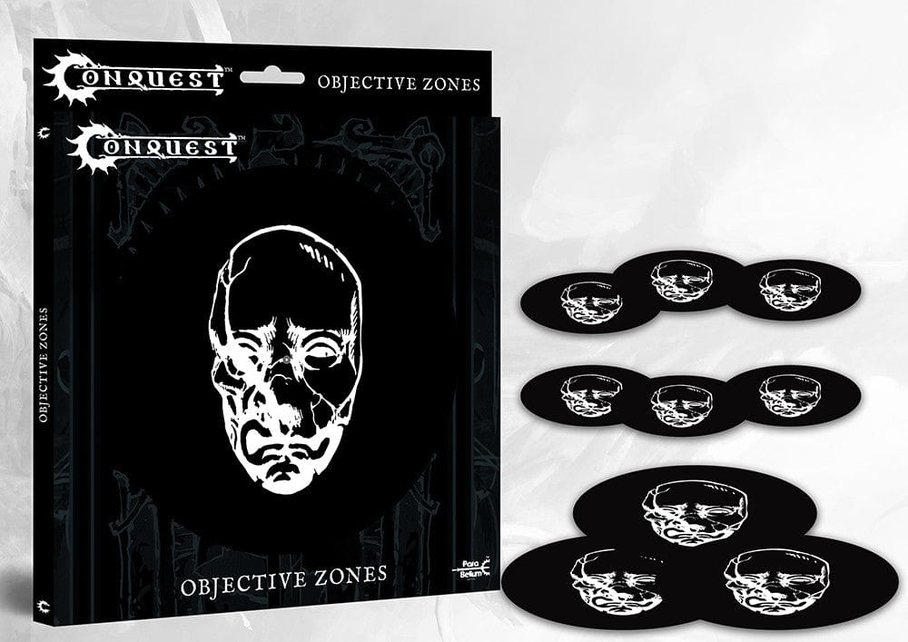 This is a set of 9 Objective Zones in Black with the White Spires Faction Logo that brings more Conquest look and feel to your table. A new and unique material that won't slip on the table, but will allow your models to easily slide over, off and around, these are ultra thin made of .5mm polypropylene. Great for any wargame play. Three 9" Zones and Six 6" Zones packaged together. Made in the EU.