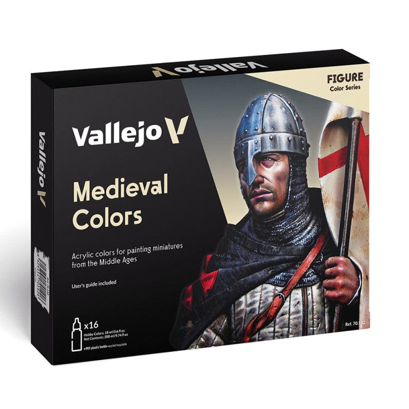 This set is a basic collection of colors for medieval themes, specially designed for those painters who want to paint figures of the time and need an assortment of versatile colors. You will find a wide selection with which to paint mesh highlights, heraldic symbols, and armor.