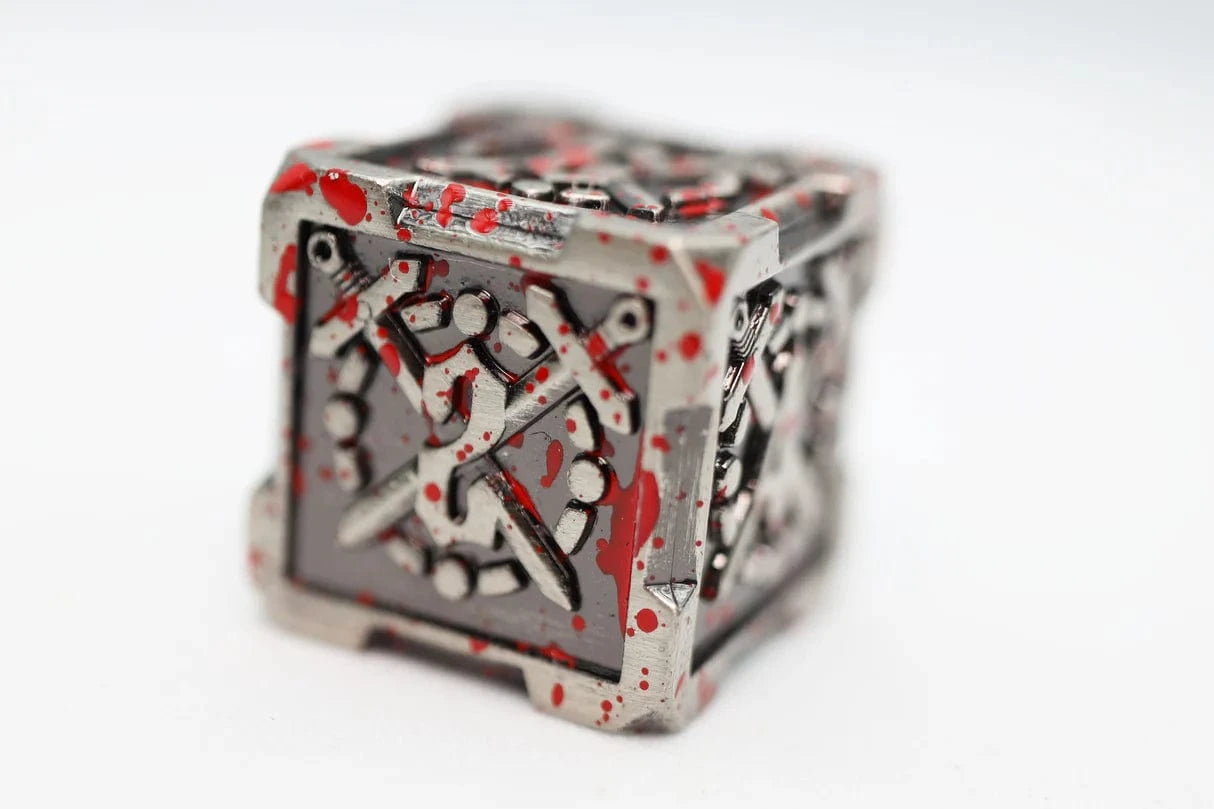 Foam Brain Games Metal Dice Set with sword shaped details on the dice faces.