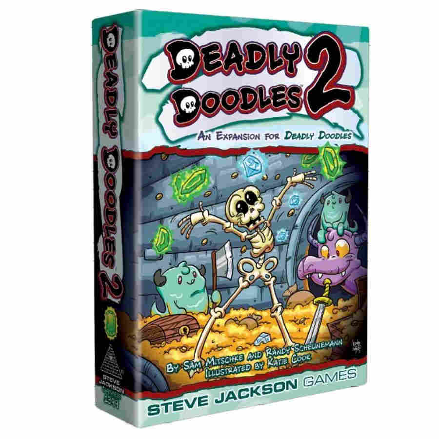 Deadly Doodles 2 contains new maps, new rules, and a new custom six-sided die for use with the Deadly Doodles base game. Some of the new boards include doors, gemstones, and other features that are triggered by rolling the die at the start of each round.