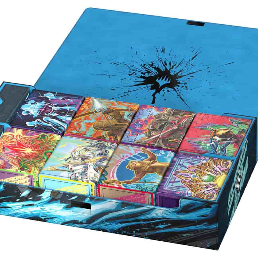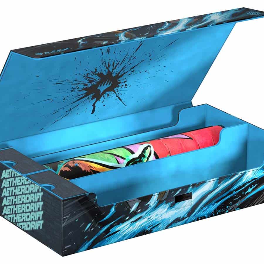 The Omnihive 1000+ Xenoskin is designed to hold multiple deck boxes, dice and/or playmats at once with the help of two flexibly positioned magnetic trays. The deck case, made of the popular and resistant Xenoskin material and printed with officially licensed art from Magic: The Gathering’s upcoming set “Aetherdrift”, is also the perfect choice for storing a larger collection of individual cards (up to 1000 double-sleeved). The Omnihive 1000+ Xenoskin’s inside is made of an elegant microfiber inner lining, while a strong magnetic closure with additional ZnapClaw mechanism ensures that cards and deck boxes are safe inside the box.