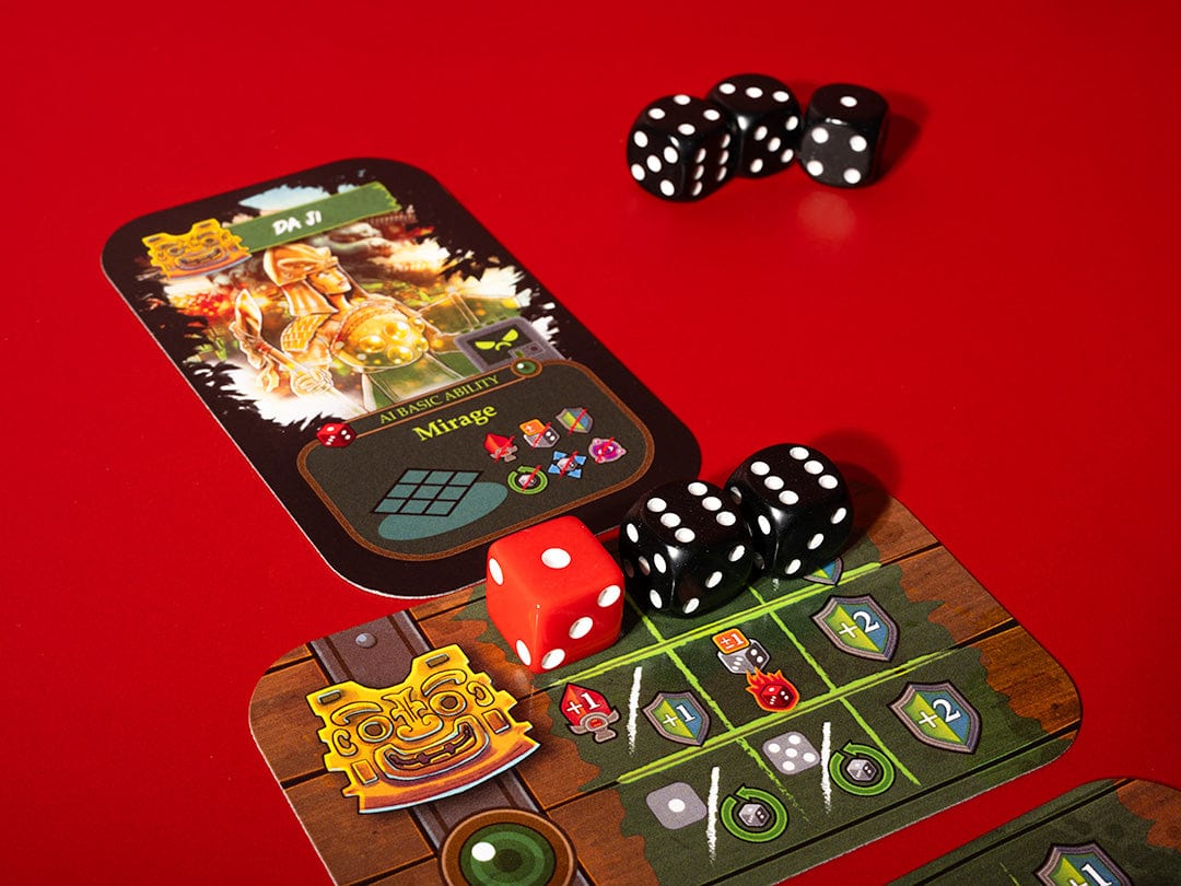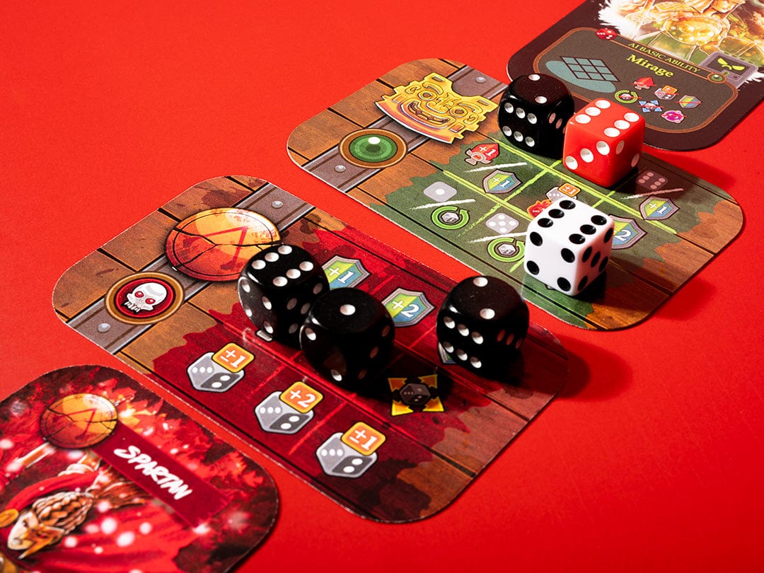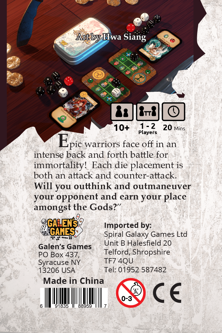 Dice Clash is a head-to-head dice placement duel in a mint tin. Each die placement acts as both your defense and attack. Out-think and outlast your opponent to emerge victorious. Each Warrior has a unique Grid and Special Power.