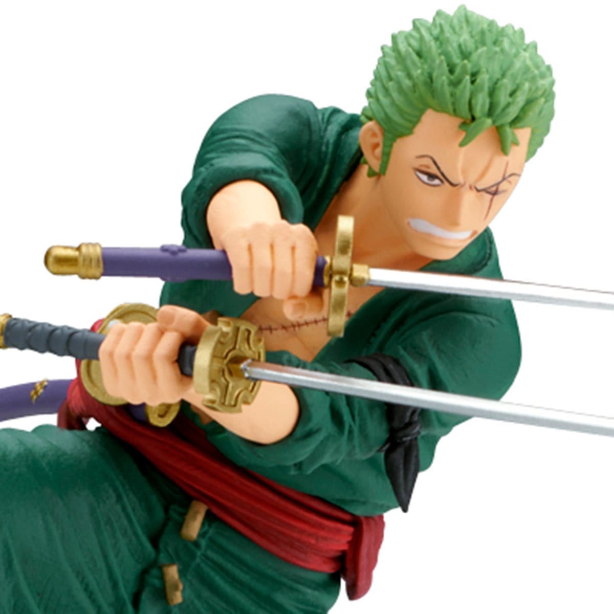 Roronoa Zoro is from the popular anime series One Piece. He is one of the top three fighters in the crew alongside Luffy and Sanji, and his dream is to become the greatest swordsman in the world. Fighting to protect his friends while on Egghead Island, he wields two of his swords and jumps in the air as he dodges a fatal blow. With a determined look in his eye, this figure is ready to battle!