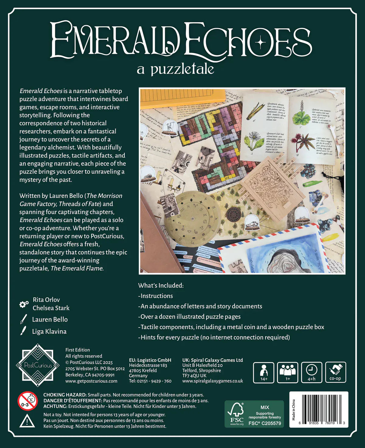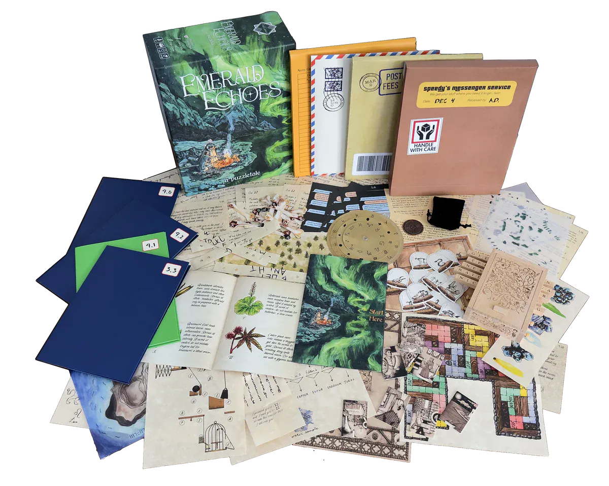 Emerald Echoes is a narrative tabletop puzzle adventure that intertwines board games, escape rooms, and interactive storytelling. Following the correspondence of two historical researchers, embark on a fantastical journey to uncover the secrets of a legendary alchemist. With beautifully illustrated puzzles, tactile artifacts, and an engaging narrative, each piece of the puzzle brings you closer to unraveling a mystery of the past.