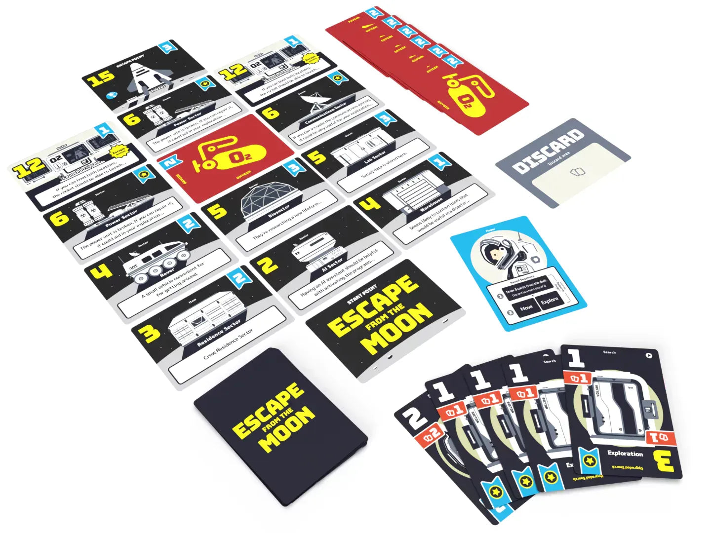 There is not much time left for activities. Can you restore the rocket in time and return to the mother ship? The challenge to Escape from the Moon begins, with you constructing a deck and managing a hand of possible actions to get yourself to safety, with success or failure depending on the decisions you make and the difficulty of your chosen scenario.