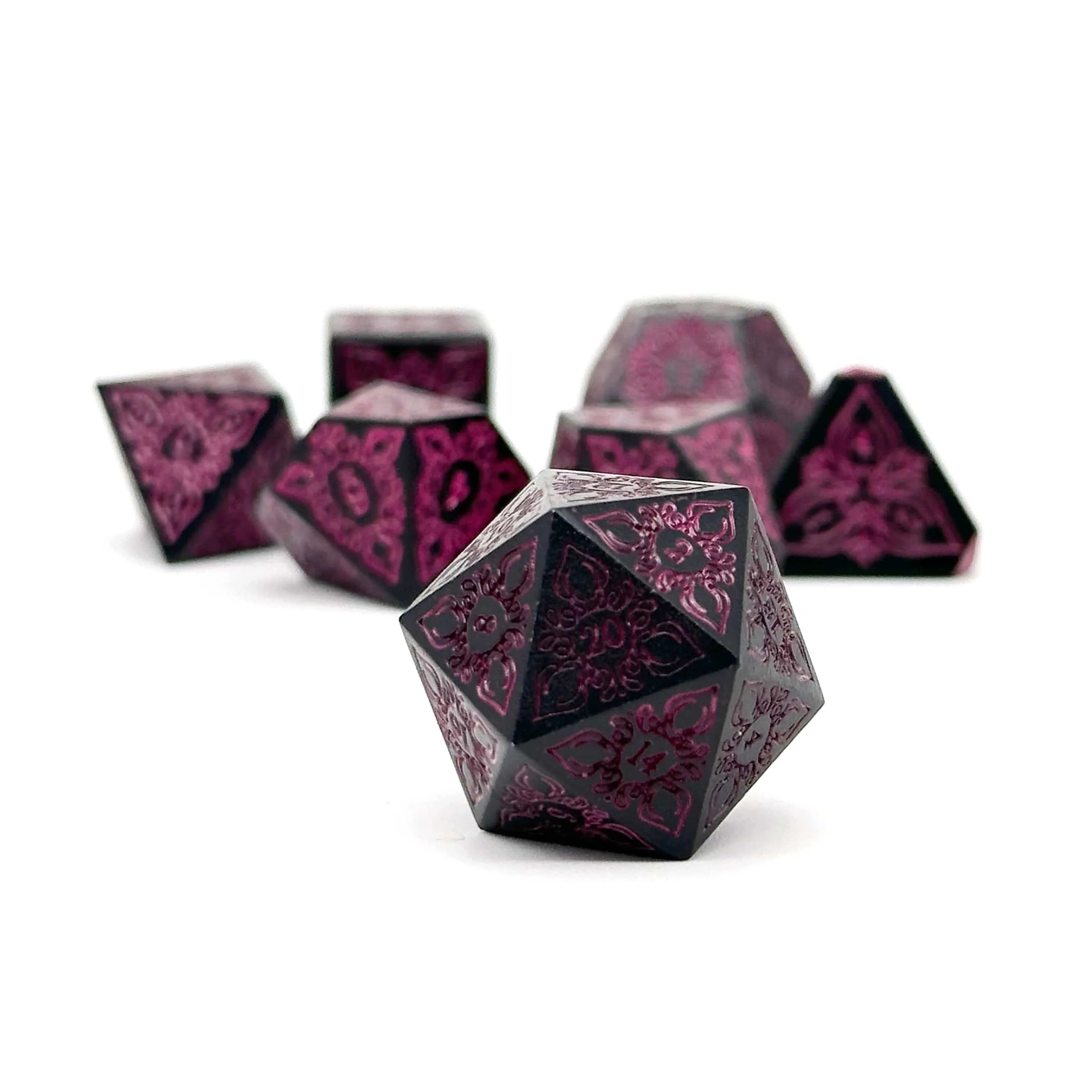 Introducing the captivating masterpiece, Feyweave - Feydark Dice Set, a remarkable testament to the extraordinary collaboration between Norse Foundry and Yaniir. Forged from the depths of black alloy and adorned with alluring pink enamel fill, this 7-piece dice set invites you to delve into a realm where imagination and innovation intertwine seamlessly.
