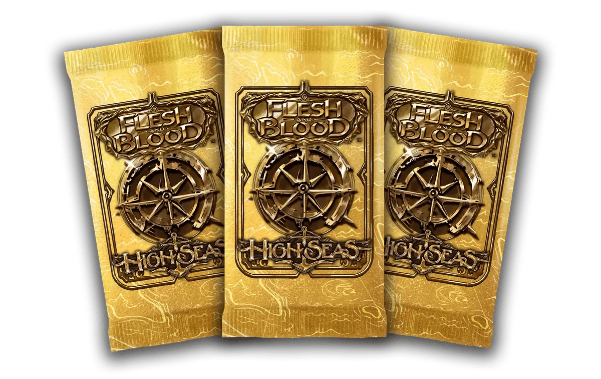 Set sail for the High Seas in search of ancient treasure, big game sea monsters, and the adventure of a lifetime! High Seas introduces the highly anticipated Pirate and Necromancer classes to Flesh and Blood. Three new dual-class heroes will navigate Rathe's treacherous open waters, each wielding a unique swashbuckling strategy that taps into previously uncharted waters of Flesh and Blood game design! Discover breathtaking Marvels, Pirate Booty, and Lost Treasures thought to exist only in fables and folklore, in Treasure Packs, found in each display of High Seas! All hands on decks! It's time to set sail for the High Seas! High Seas is a standalone booster set featuring 265 cards.