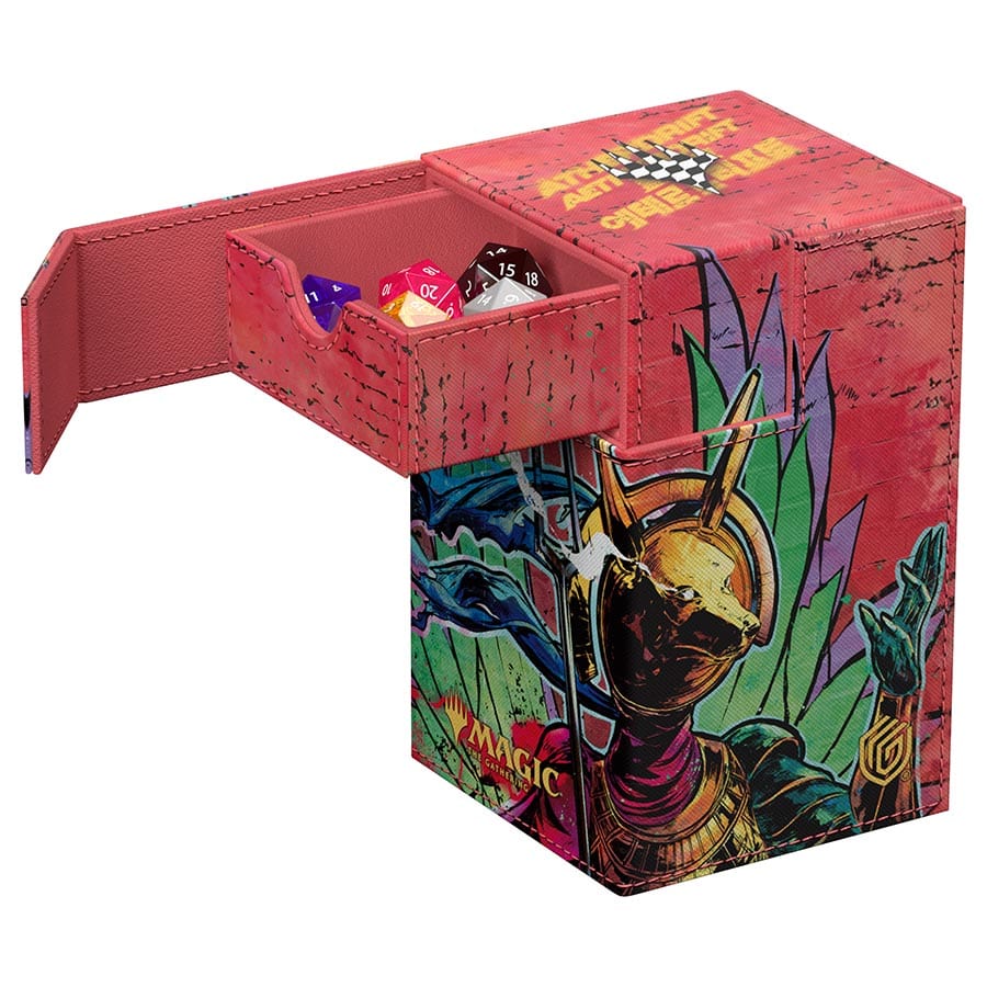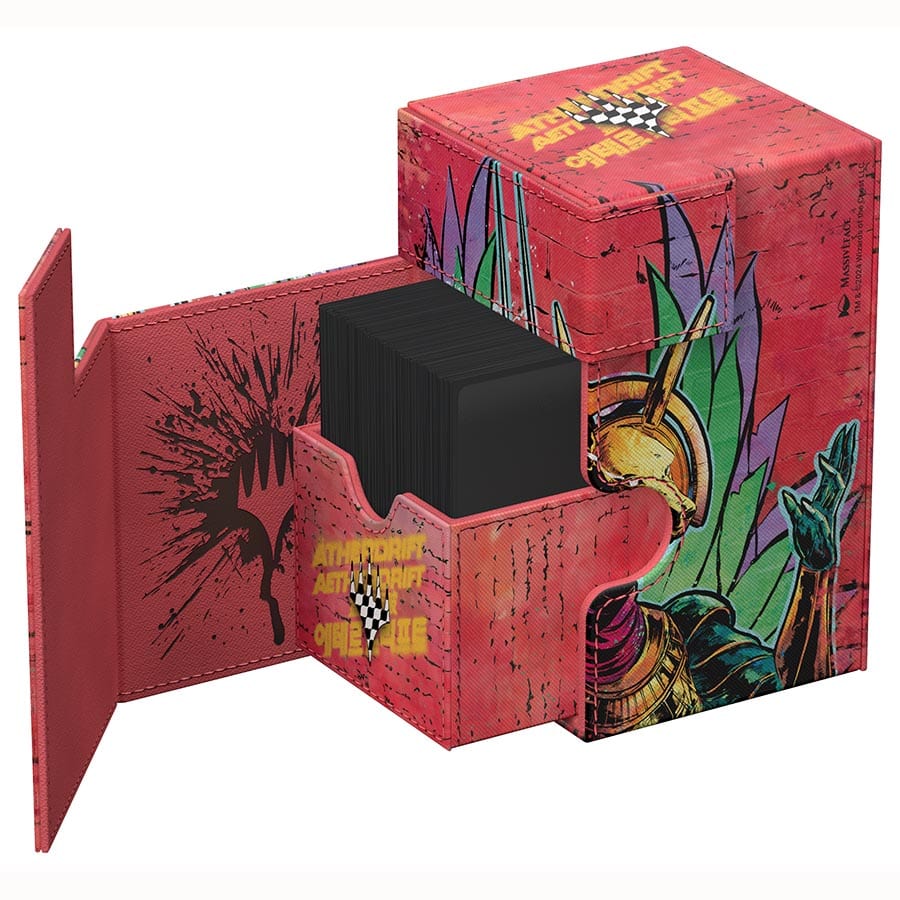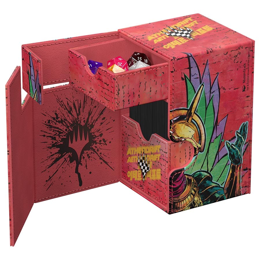 The Flip’n’Tray 100+ Xenoskin is a high-quality TCG deck box that offers premium card protection thanks to its resistant Xenoskin material, microfiber inner lining, and strong magnetic closure. The deck box has an integrated and removable accessory tray for dice that can be accessed independently and is printed in full color with officially licensed artworks from Magic: The Gathering’s upcoming set “Aetherdrift”. The Flip’n’Tray 100+ Xenoskin is optimized to hold 100 double-sleeved or 120 single-sleeved cards in Ultimate Guard sleeves.