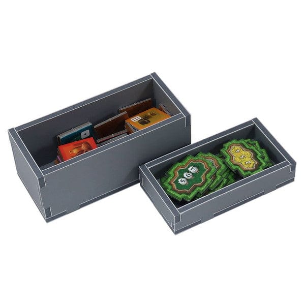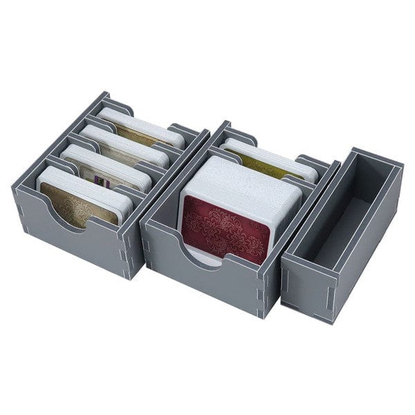 Insert compatible with Castles of Burgundy: Anniversary Edition® , and also has trays for The Card Game® version. The design provides both efficient storage and improved game play. The trays can be utilised during the game, and they greatly aid set-up and clear-away times. The rules and boards act as a lid on top of the trays.
