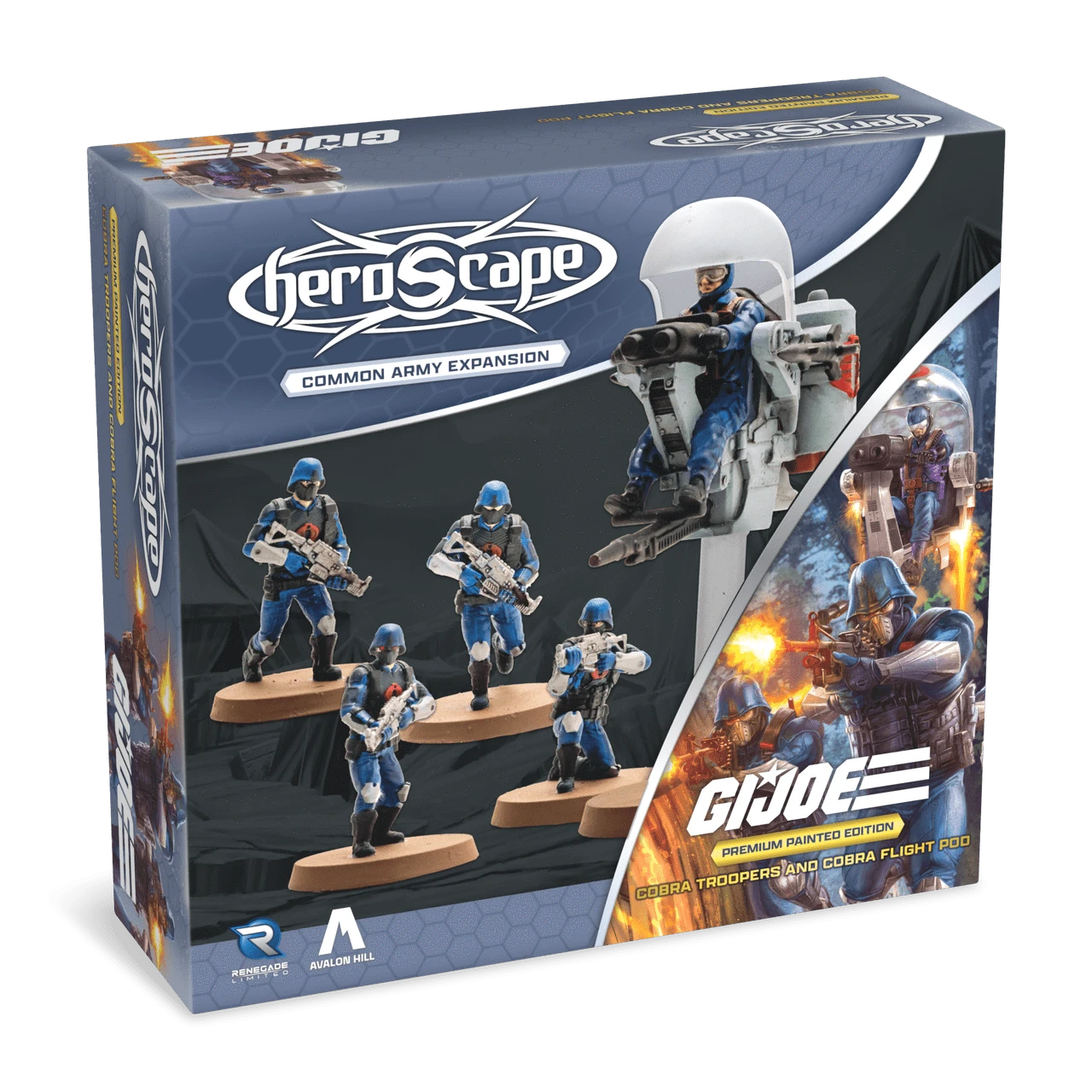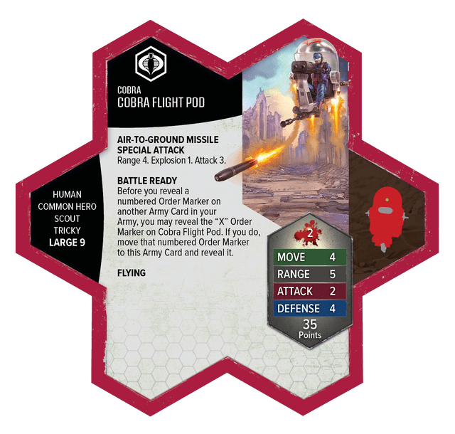This expansion includes one Common Hero, one 4-figure Common Squad, and two army cards. COBRA Troopers strengthen each other when fighting alongside unique COBRA heroes and can activate their powerful leaders before their own turn. Above the battlefield, the COBRA Flight Pod rains down explosive air-to-ground missiles while ready to jump into action at a moment’s notice. Together, these forces bring ruthless precision and aerial superiority to your Heroscape battles.
