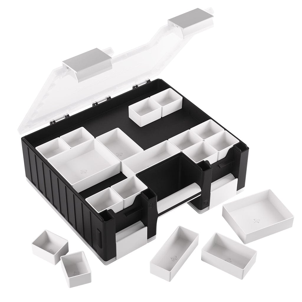 The Game Castle is a perfect storage solution for 6 Commander Decks (6x 100 double-sleeved cards), tokens, dice, movement/range tools, and many other gaming accessories! One side of the box houses six removable card holders for 600 double-sleeved cards in Thick Inner Sleeves or 800 board-game-sleeved cards. The other side holds 19 removable trays in 5 different sizes, including an extra-long tray to store movement/range tools, two trays in Mini-American card size, and two in Standard card game size. The trays can be swapped with those from the Gamegenic Token Silo family, offering many different size and color combinations. The innovative clip mechanism ensures a precise and secure closure.