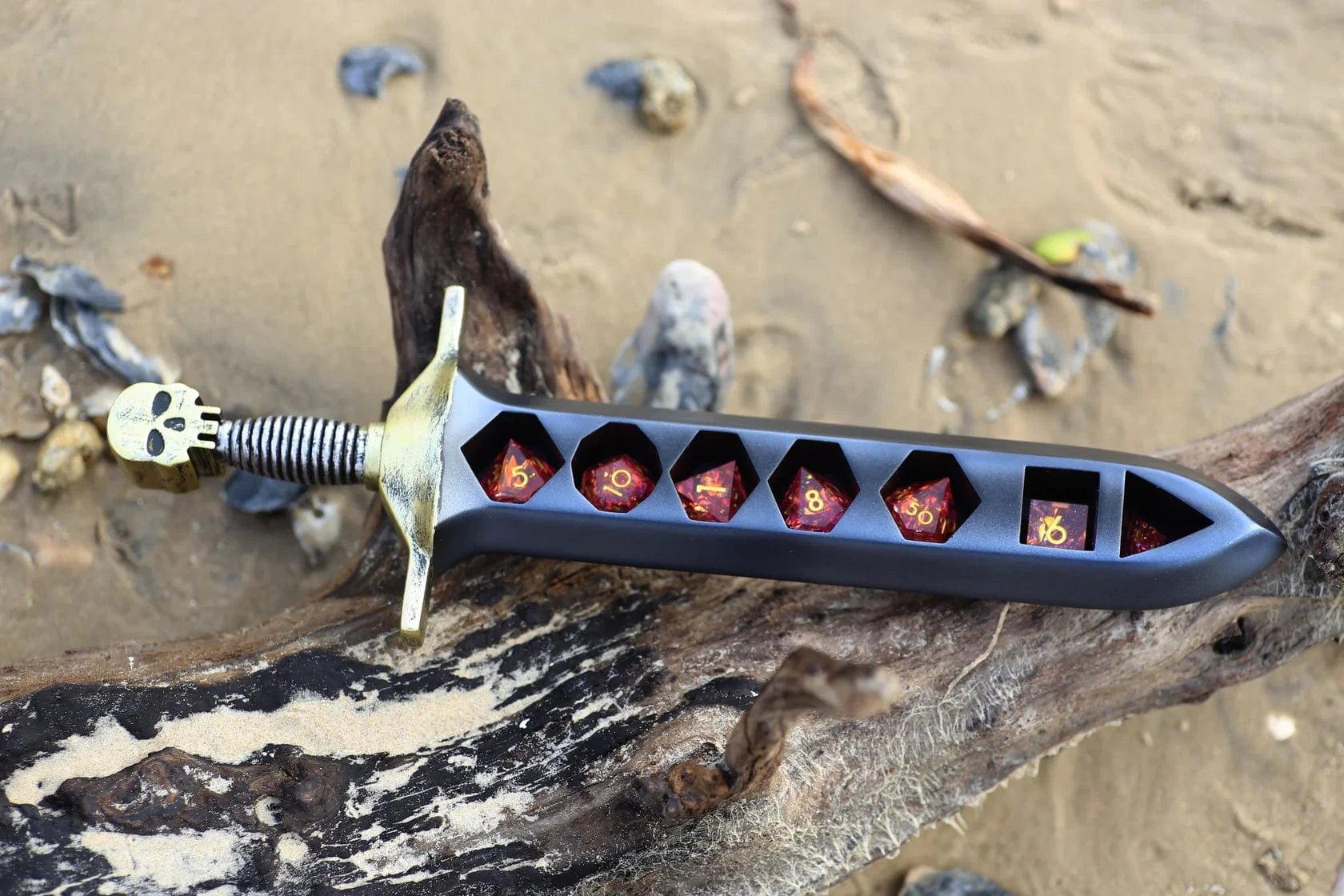 Grim Dagger Dice Case with sheath cover, dice not included, available in 5 colors: Ancient Gold, Ancient Silver, Red, Blue and Purple.