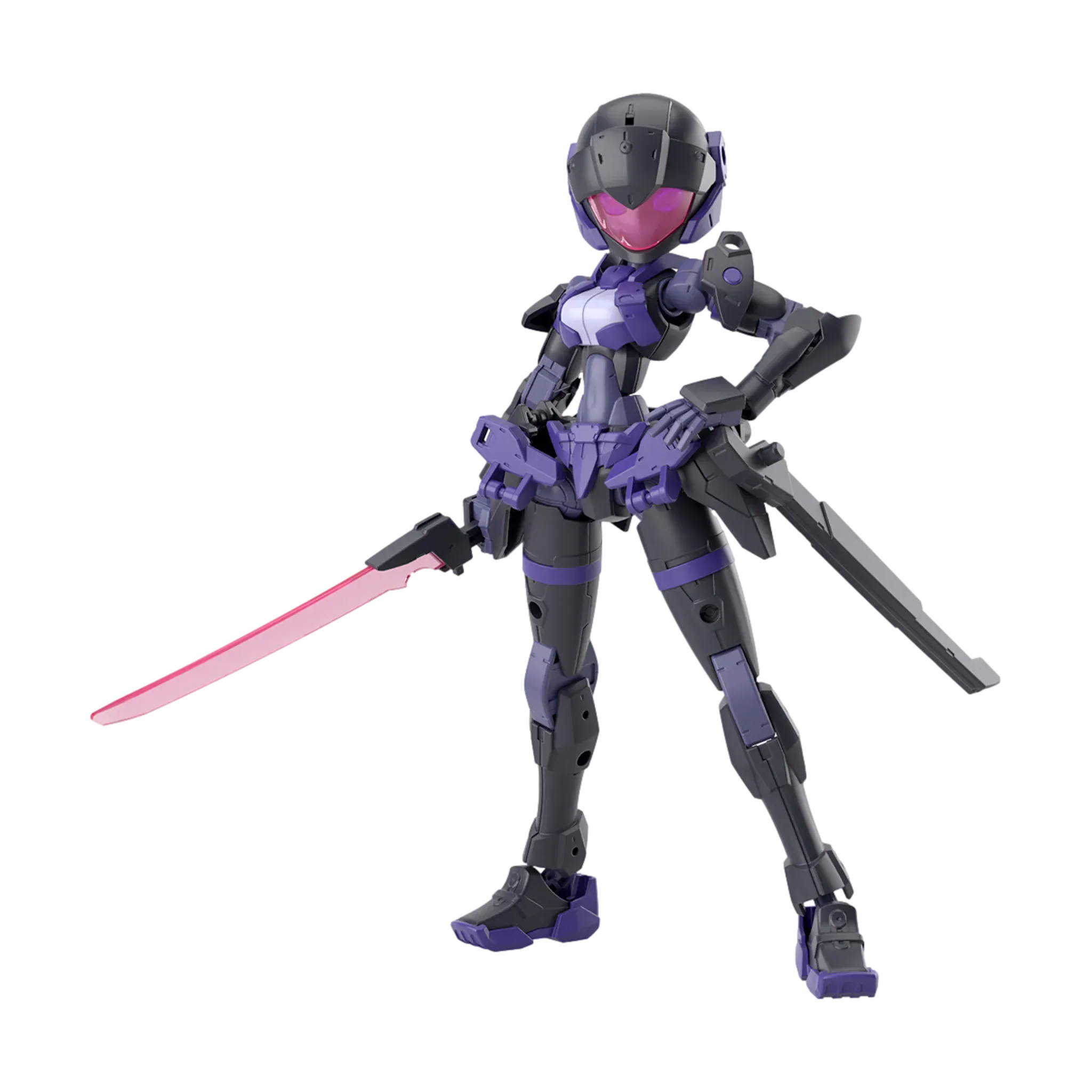 The kit includes parts to build the figure, armor, and weapons, with two types of armor for the shoulders and waist. The adjustable head visor adds versatility, while the clear visor parts can be repurposed as waist joints. The newly designed energy blade is removable from its sheath for dynamic poses. Additionally, a chest part is included for compatibility with Spinatia armor (sold separately), enhancing the creative possibilities.