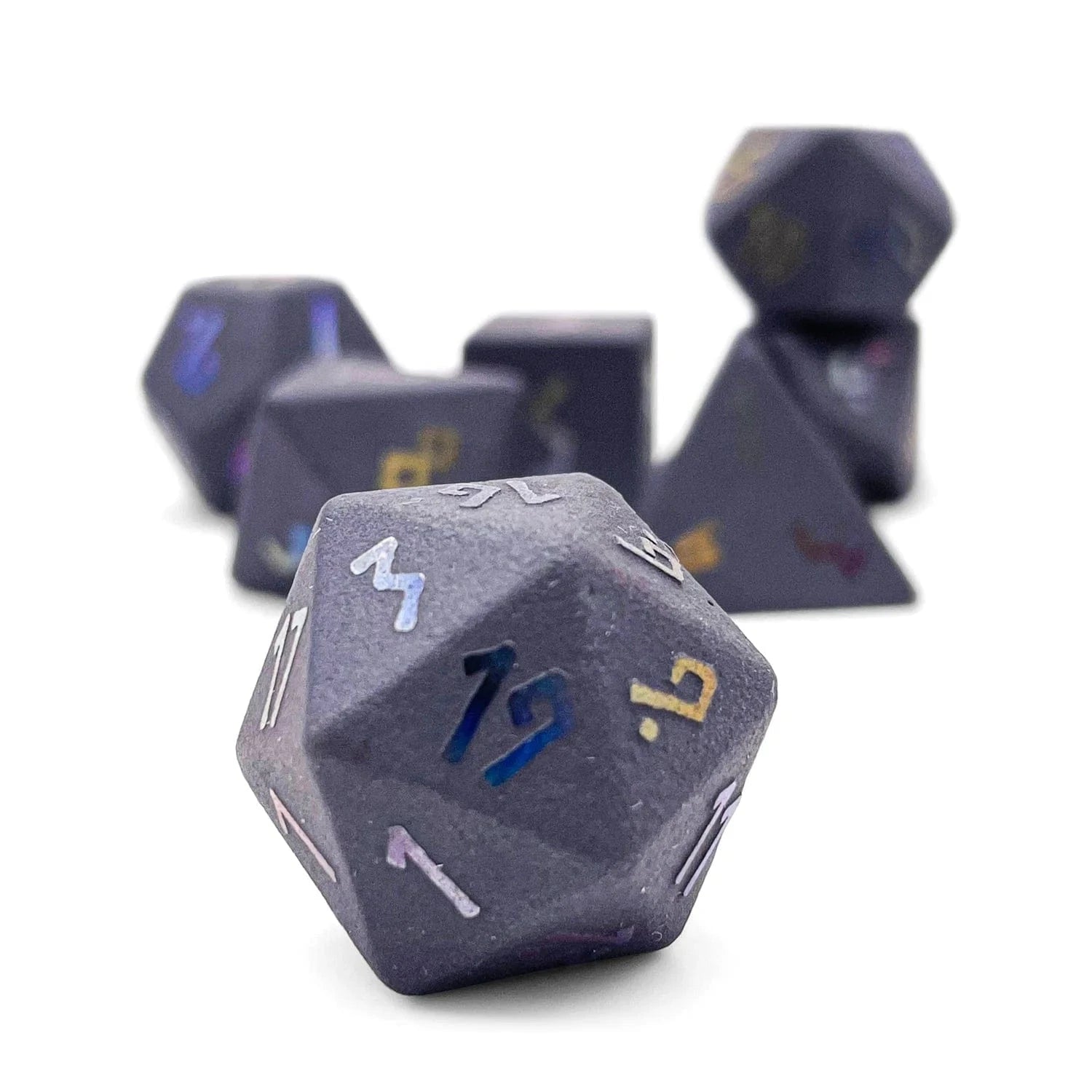 Luxurious Design. Carefully carved and polished, these polyhedral dice imbues a mysterious grey hue with raised holographic number engravings.