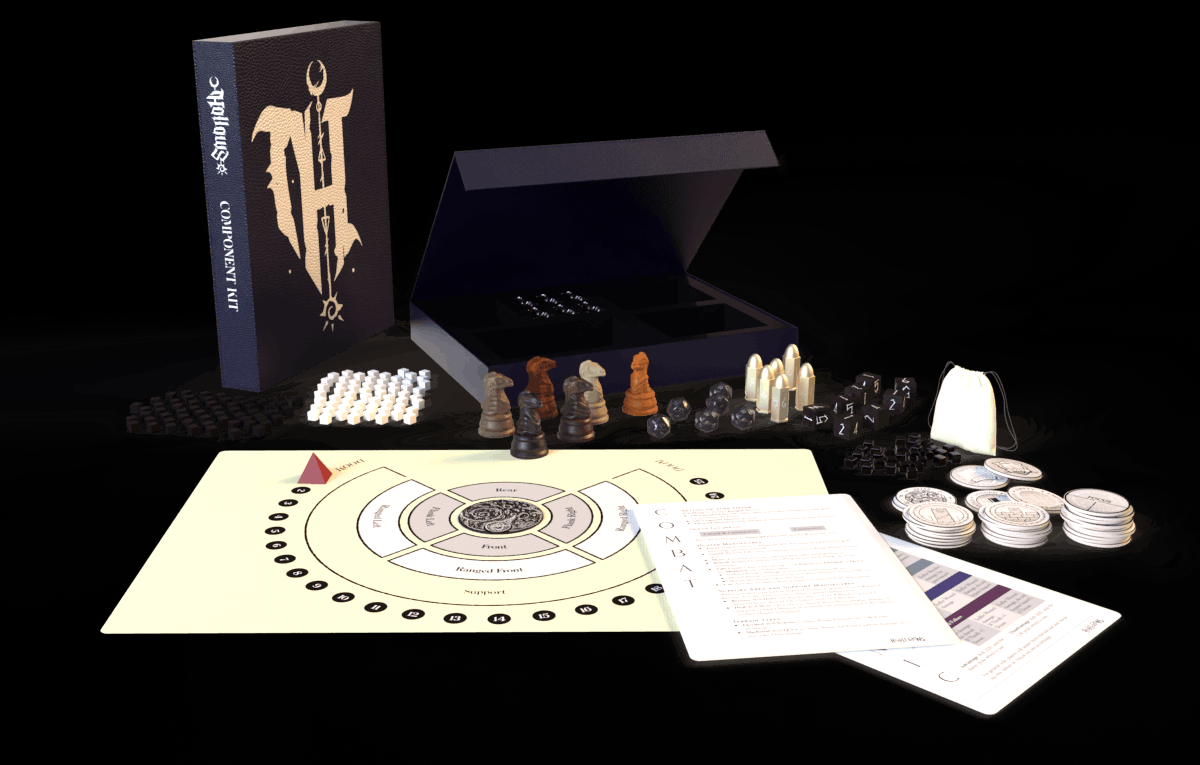 You can play Hollows with a printout of the tactical grid, some standard 20-sided dice, and an assortment of coins, other dice, and tokens from games you already own. We know this, because that’s how we played Hollows throughout most of its development.