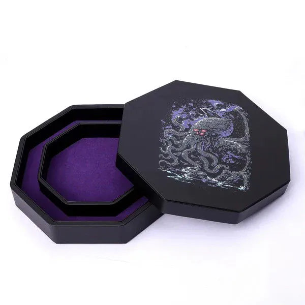 Keep your gaming table organized and your dice safe with the Heroes Hoard Dice Tray & Keeper featuring an intricate Cthulu design. This premium leatherette case combines functionality with striking fine art aesthetics, showcasing detailed artwork that brings cosmic horror vibes to your tabletop sessions. The spacious interior provides secure storage for your favorite dice sets, while the durable construction ensures your collection stays protected between games. Whether you're a seasoned dungeon master or casual player, this tray elevates your gaming experience with both style and practicality. Perfect for displaying your dice collection or keeping everything contained during intense gameplay moments.