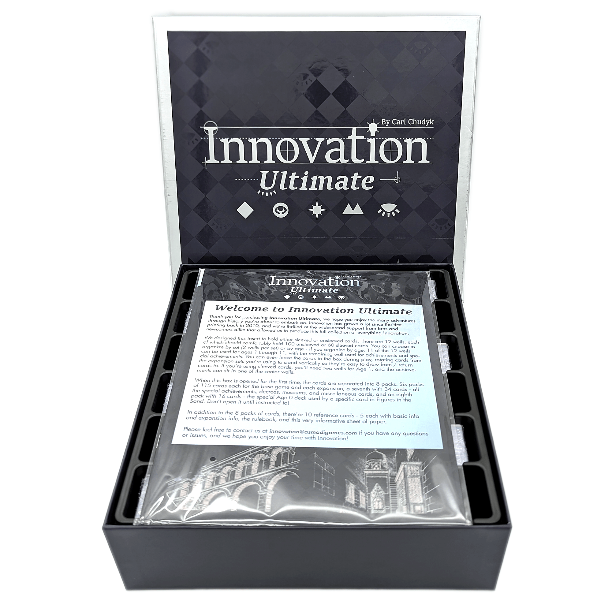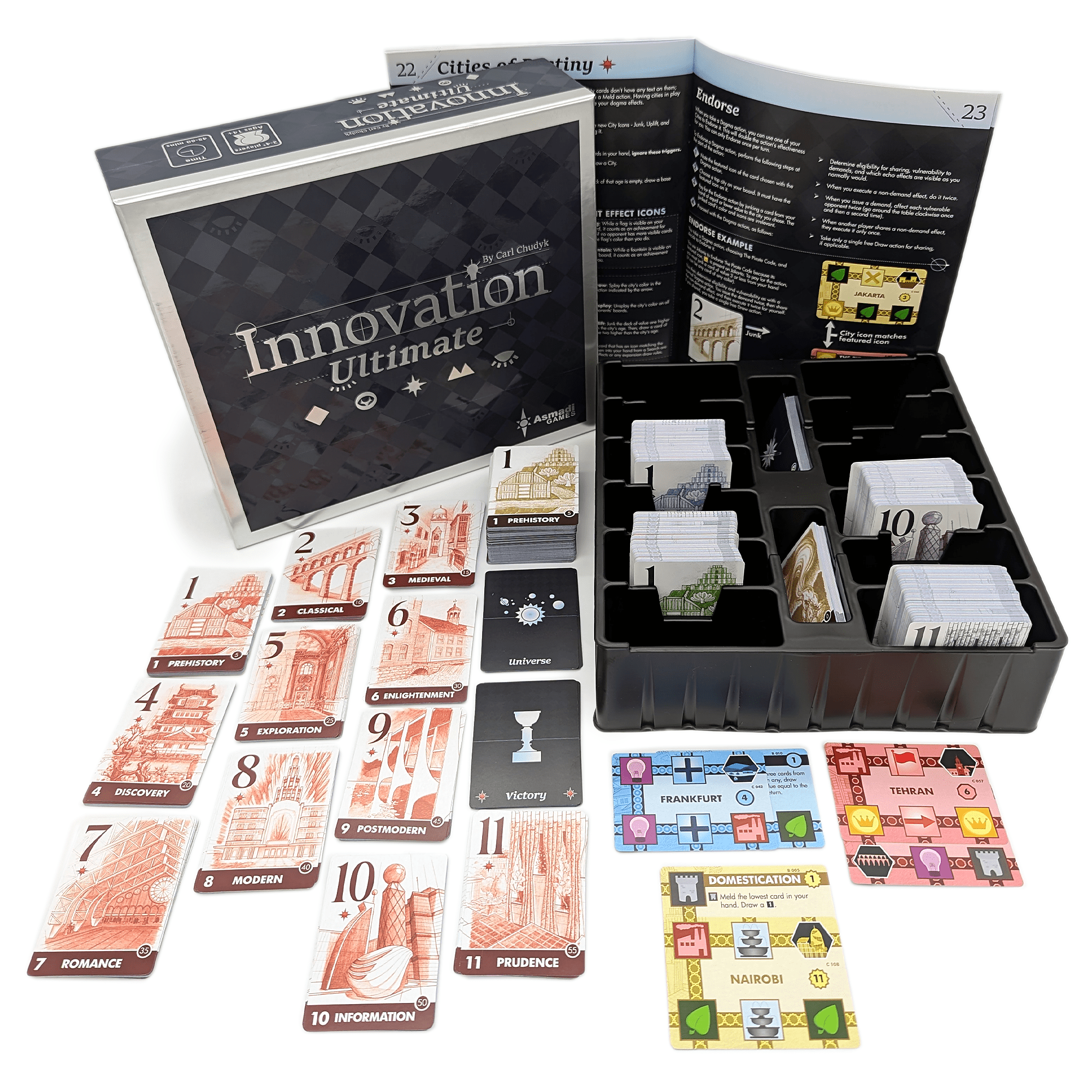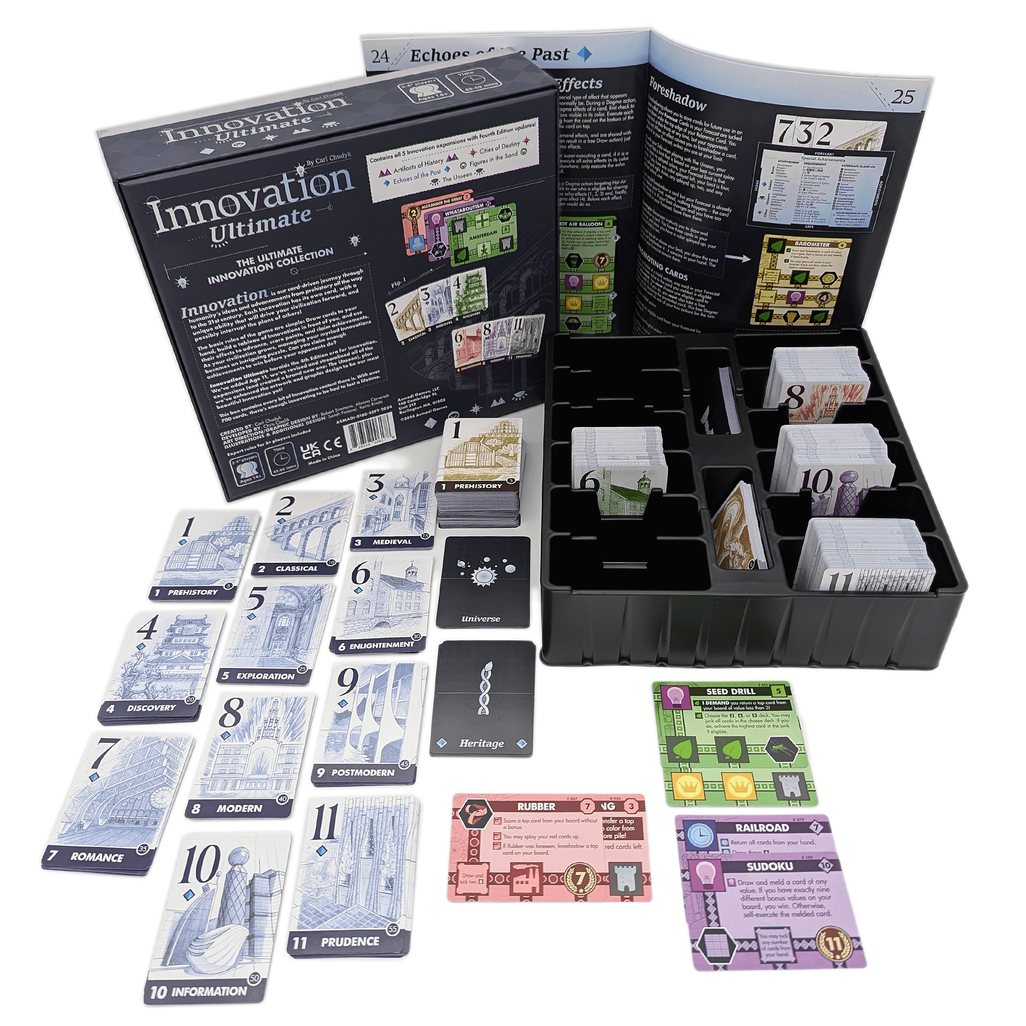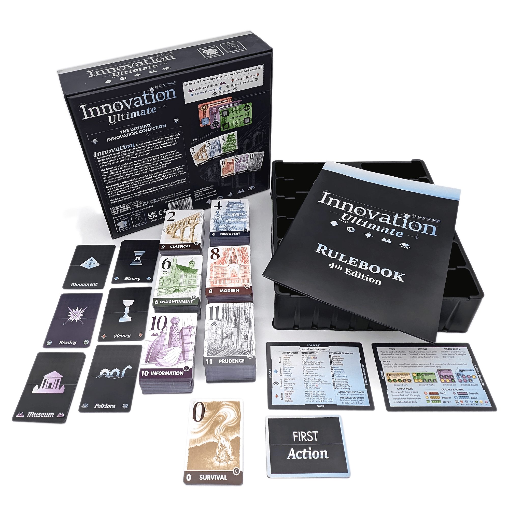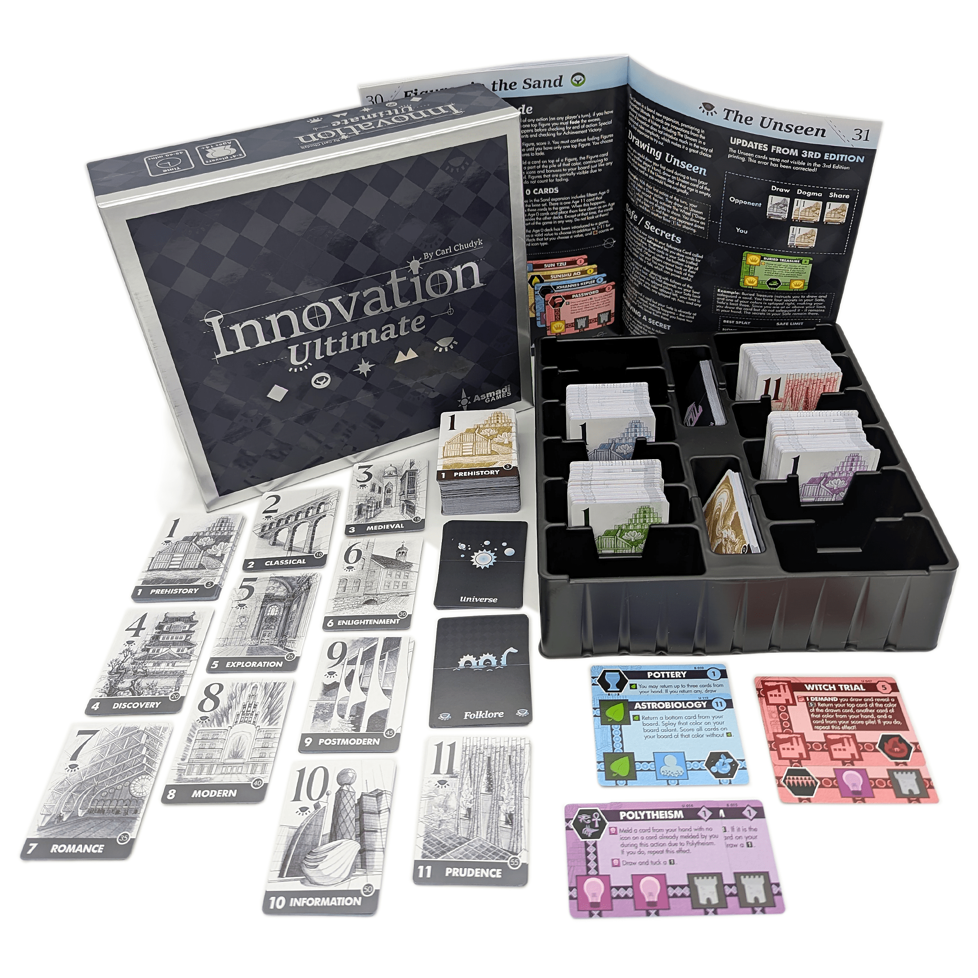 Innovation Ultimate is a box set containing Innovation and all five of its expansions, which includes a brand new expansion titled The Unseen. Many, many updates have been made to this edition. First, Age 11 has been added, representing the recent past and potential near future at the time of release. Lots of language and mechanics have been streamlined, and in particular, the expansions have all been heavily reworked to be more accessible and easy to include while playing.