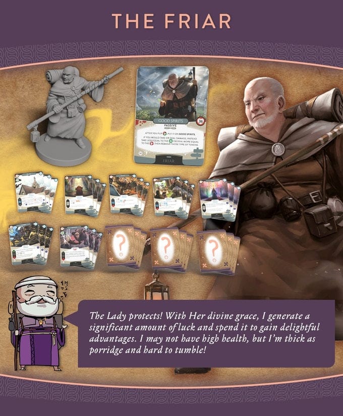 THE FRIAR roams the countryside, bringing aid and cheer. He claims the Lady herself guides his humble path, though if that's true, she seems to have a soft spot for taverns. He’s not versed in violence, but he does believe in beginner’s luck.